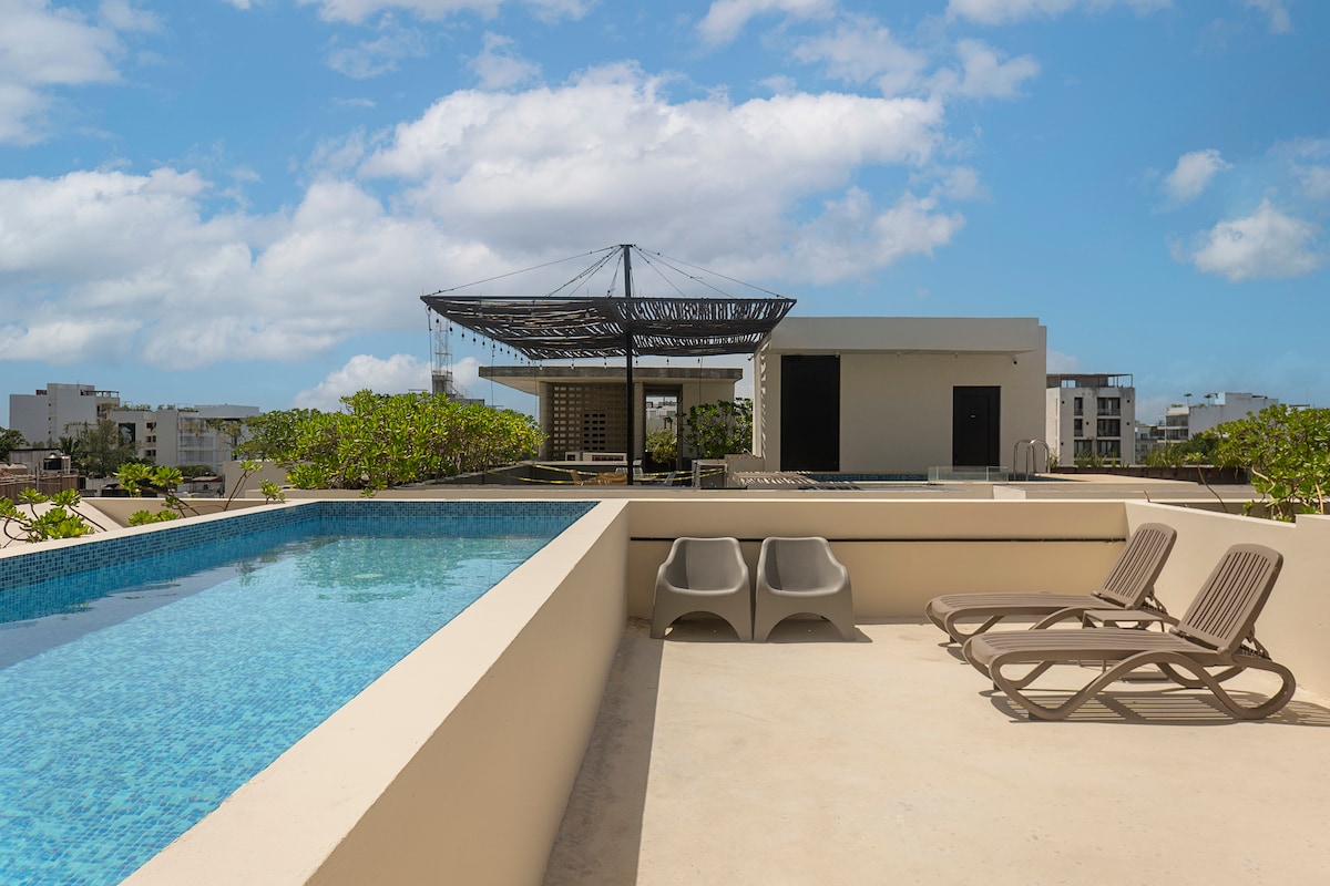 Lovely Studio, all furhished and equipped for 4 (PAX), enjoy of a new amazing pool and the Kool Beach Club with Sea View, Bar, Jacuzzi, A/C, Gym, Security 24/7, Parking, just steps from 5th AVE and on the famous Mamitas Beach ... the tranquility of the Mexican Caribbean, Great option for who is looking for a place safe in the downtown, the beach, Supermarkets, cafés, stores, artisan shops and also in a quiet Condominium in the heart of Playa del Carmen. Immediate attention 24/7.