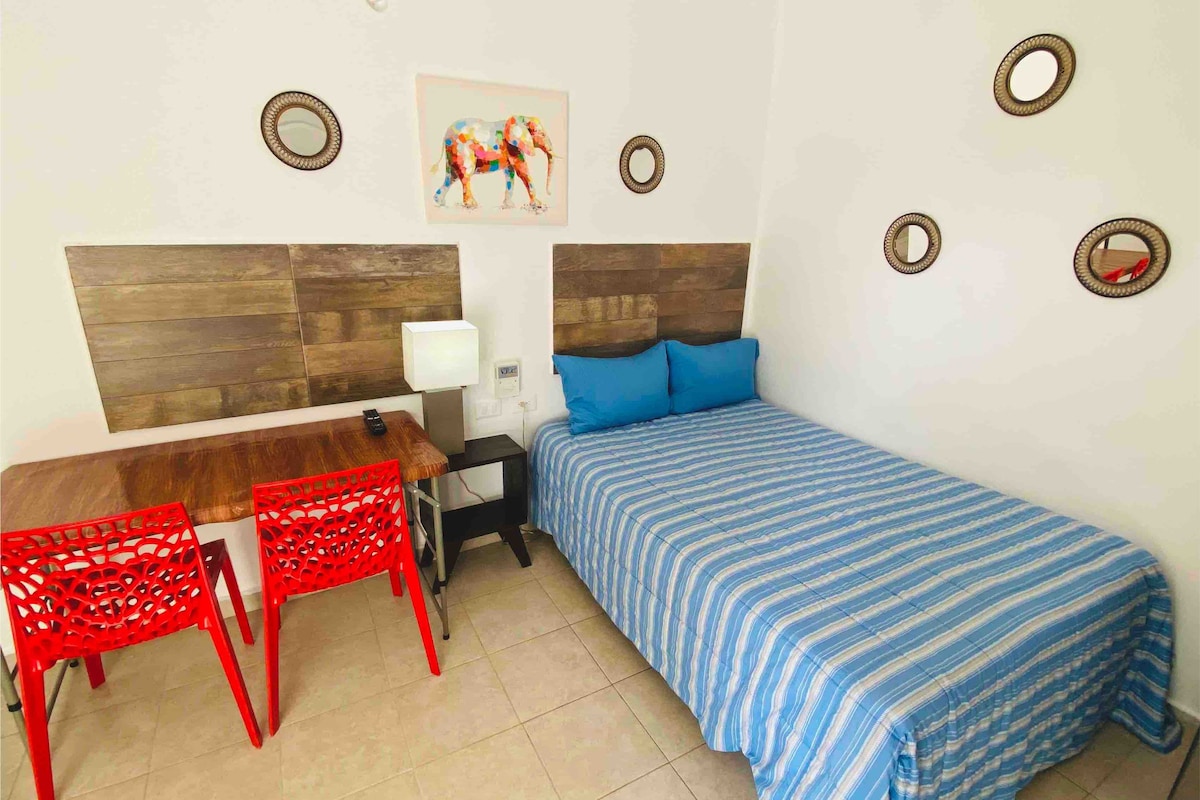 Cómodo y bonito estudio con excelente ubicación; a 5 minutos del Aeropuerto Internacional de Cozumel y a 10 minutos del Malecón. La habitación es independiente, amueblada y equipada. Cuenta con el mobiliario necesario para que tu estancia en la Isla sea cómoda y placentera: baño, agua fría y caliente, aire acondicionado, secadora de cabello, plancha, cocineta, cafetera, refrigerador, Wi Fi, incluimos toallas, café, botellas de agua y la mejor atención posible.