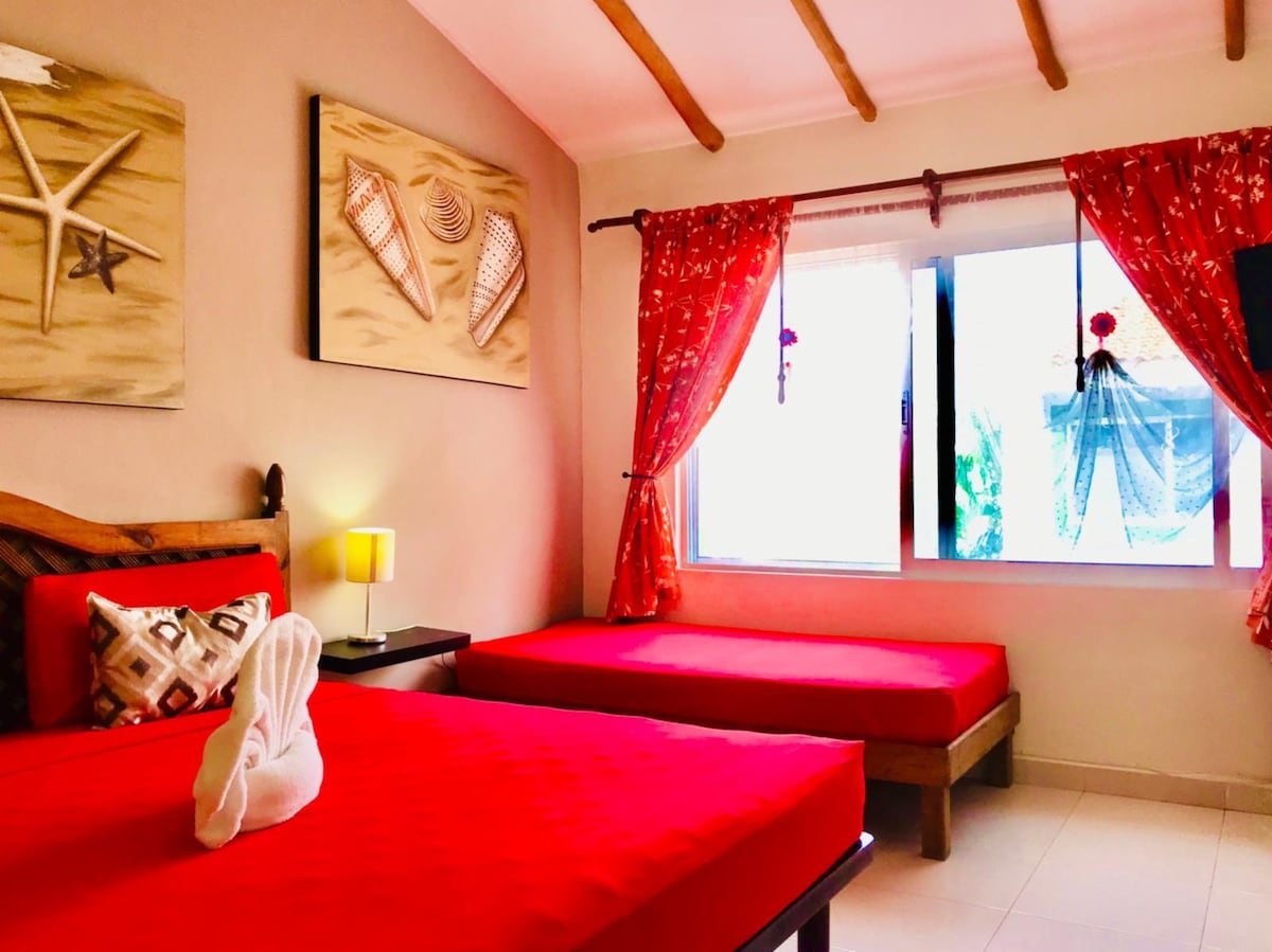 One bedroom apartment with living room, small kitchen, bathroom with shower and hot water, air conditioning, service, pool, hammocks, relaxation area, cleaning included, cotton sheets and towels. In the best area of the island to a block of the Caribbean Sea, with parking and surrounded by tropical gardens just 4 blocks from the island's center.