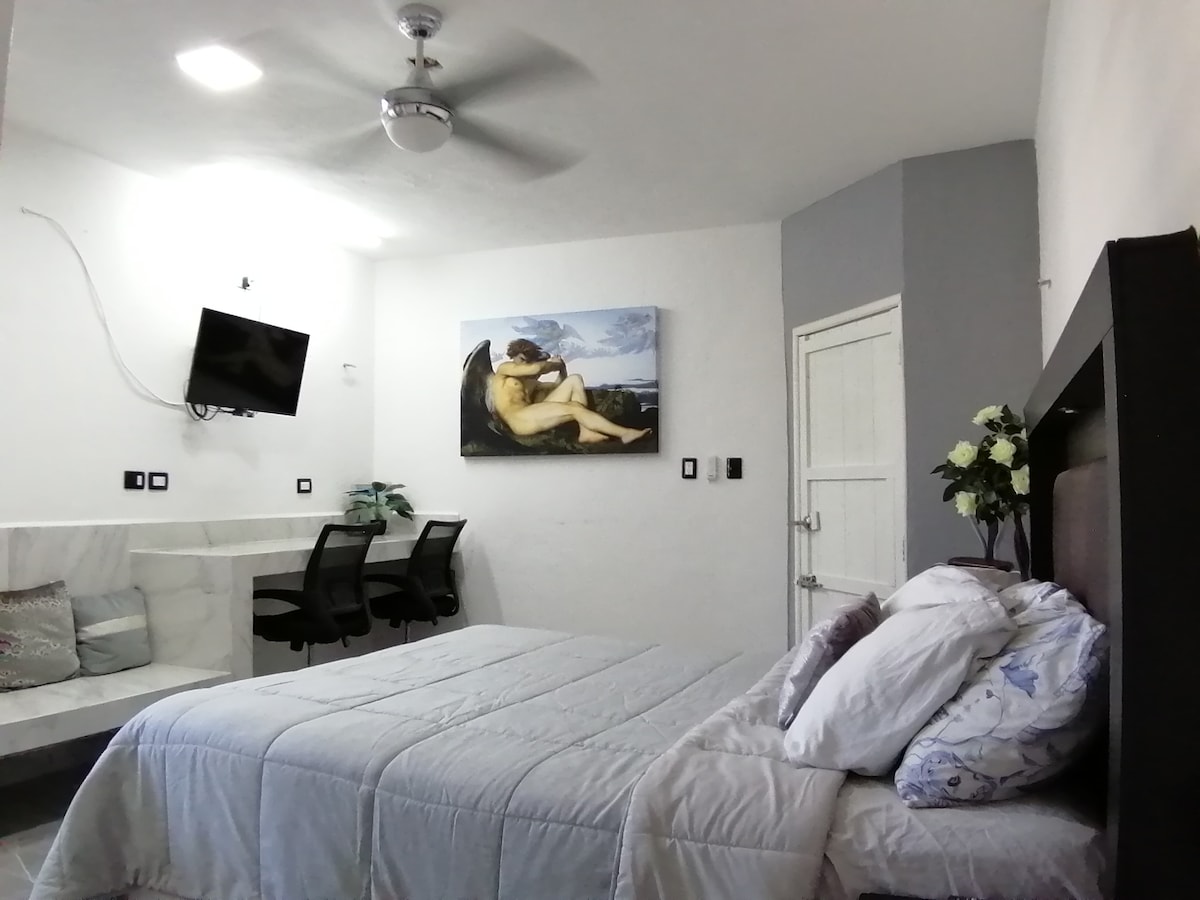 Lindo y amplio estudio con luz natural y ventilación. Muy bien equipado con todo lo necesario. Cama Queen, mesa para comer y todo lo necesario para un desayuno continental, NO COCINA. A unas cuadras del malecón y vista del mar (15 minutos caminando) Lavandería, tiendas de abarrotes, Oxxo, farmacia, iglesia y parque a una cuadra. El estudio cuenta con caja para llaves para un check-in independiente.