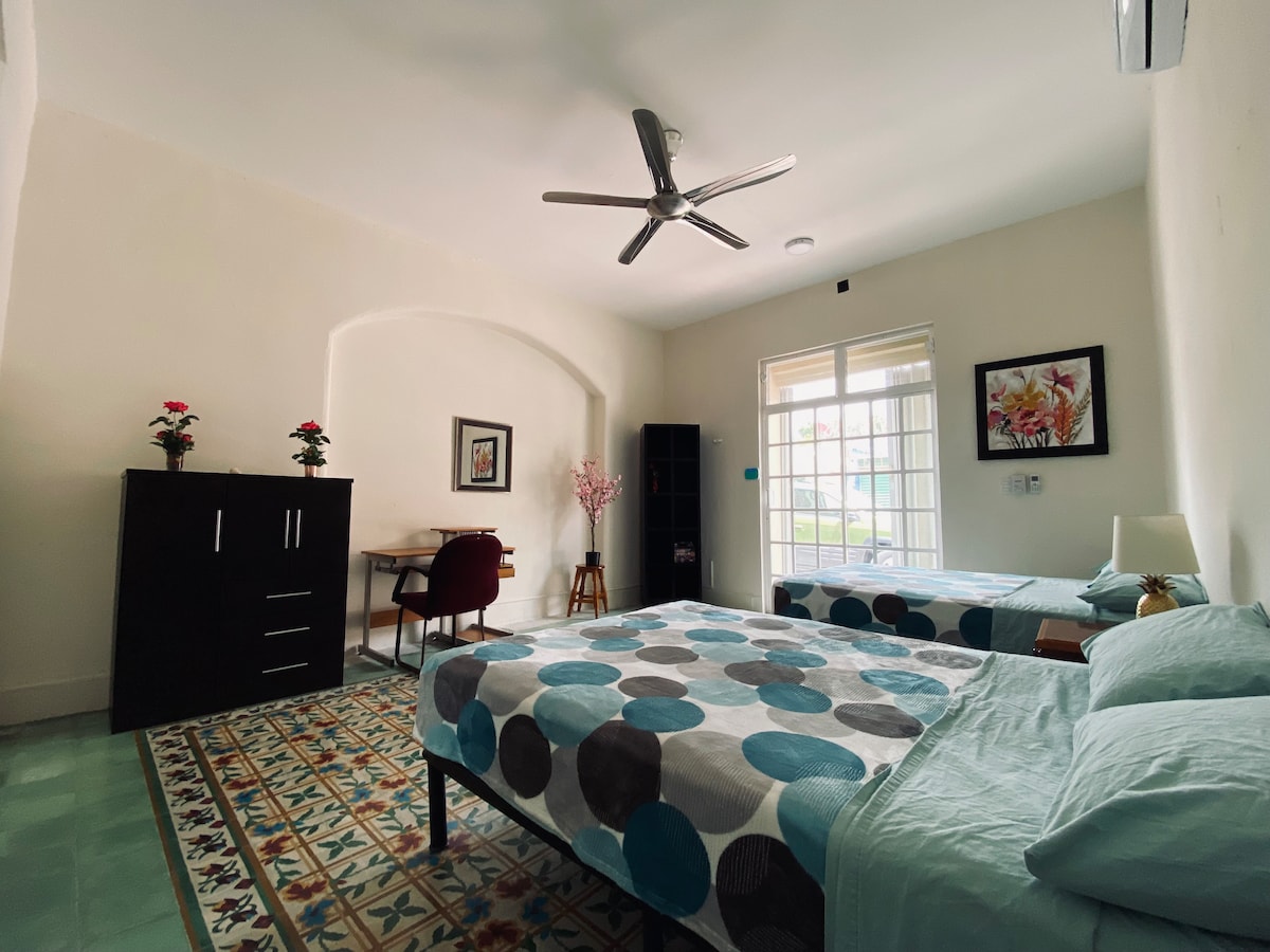 Este elegante alojamiento es ideal para viajes en pareja o familia; la casa se encuentra en la planta de arriba, lo cual ofrece: - 1 habitación con dos camas individuales,ventilador de techo y aire acondicionado -1 habitación con cama matrimonial, aire acondicionado y ventilador de techo (con un closet). -1 baño completo ( con agua fría y caliente) - Cocina completa - Con muebles, televisión y Wifi - Balcón