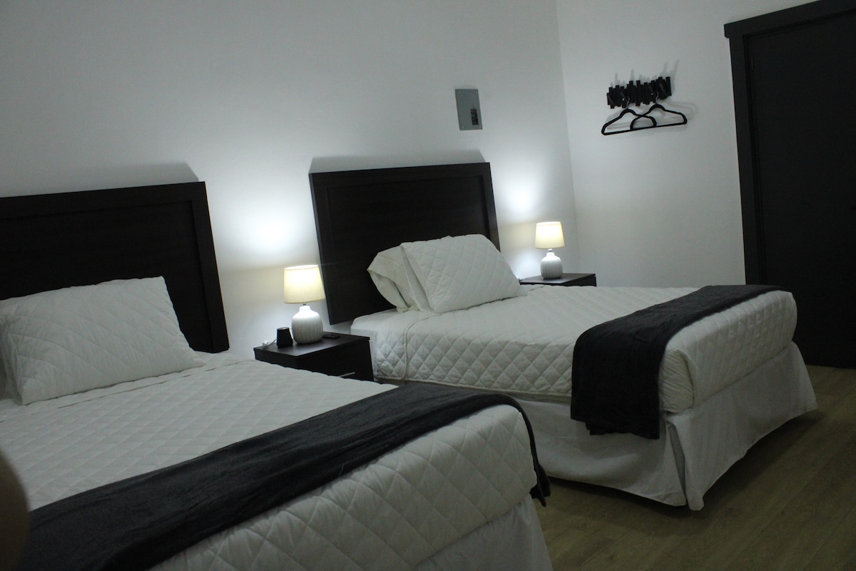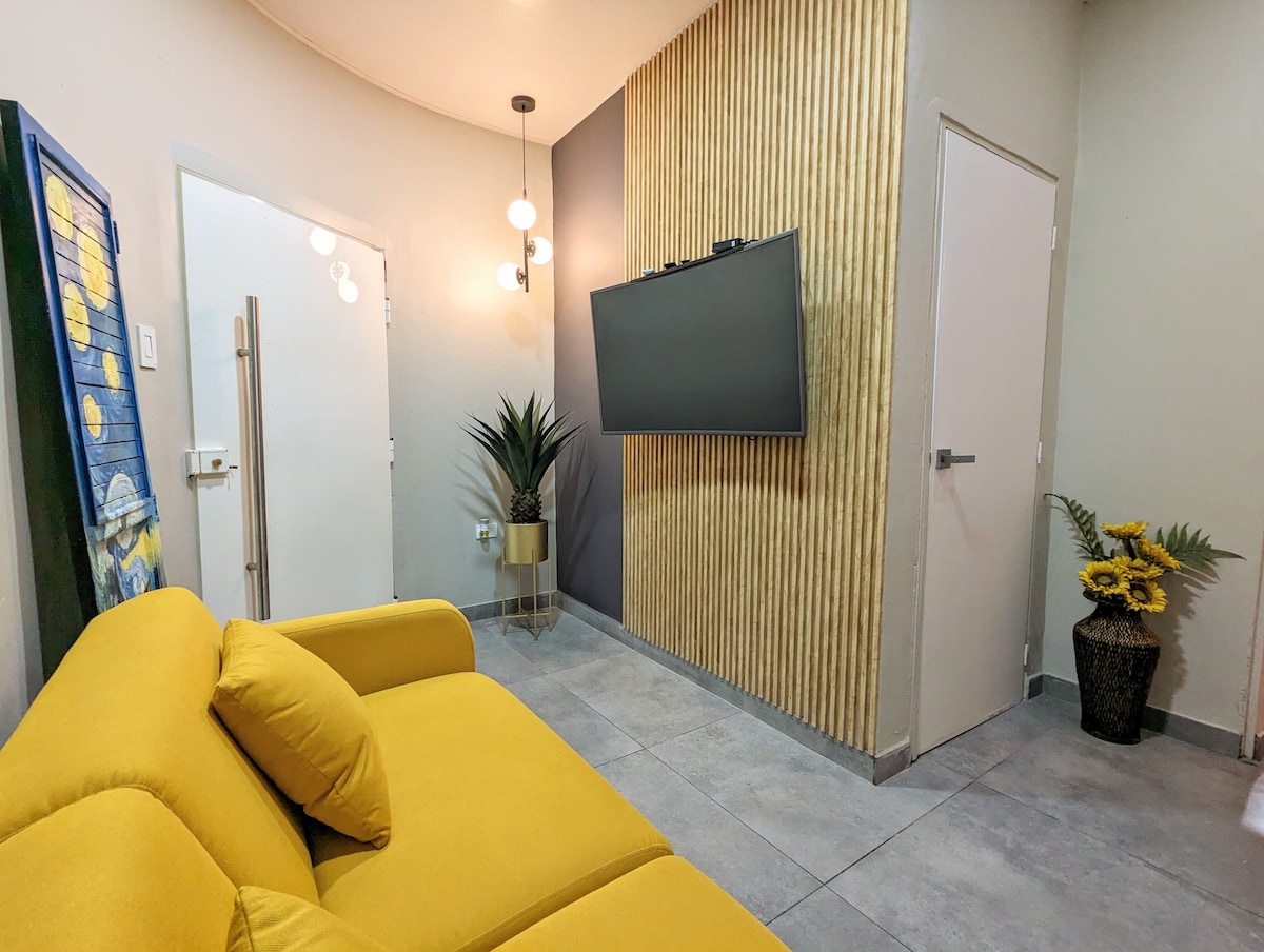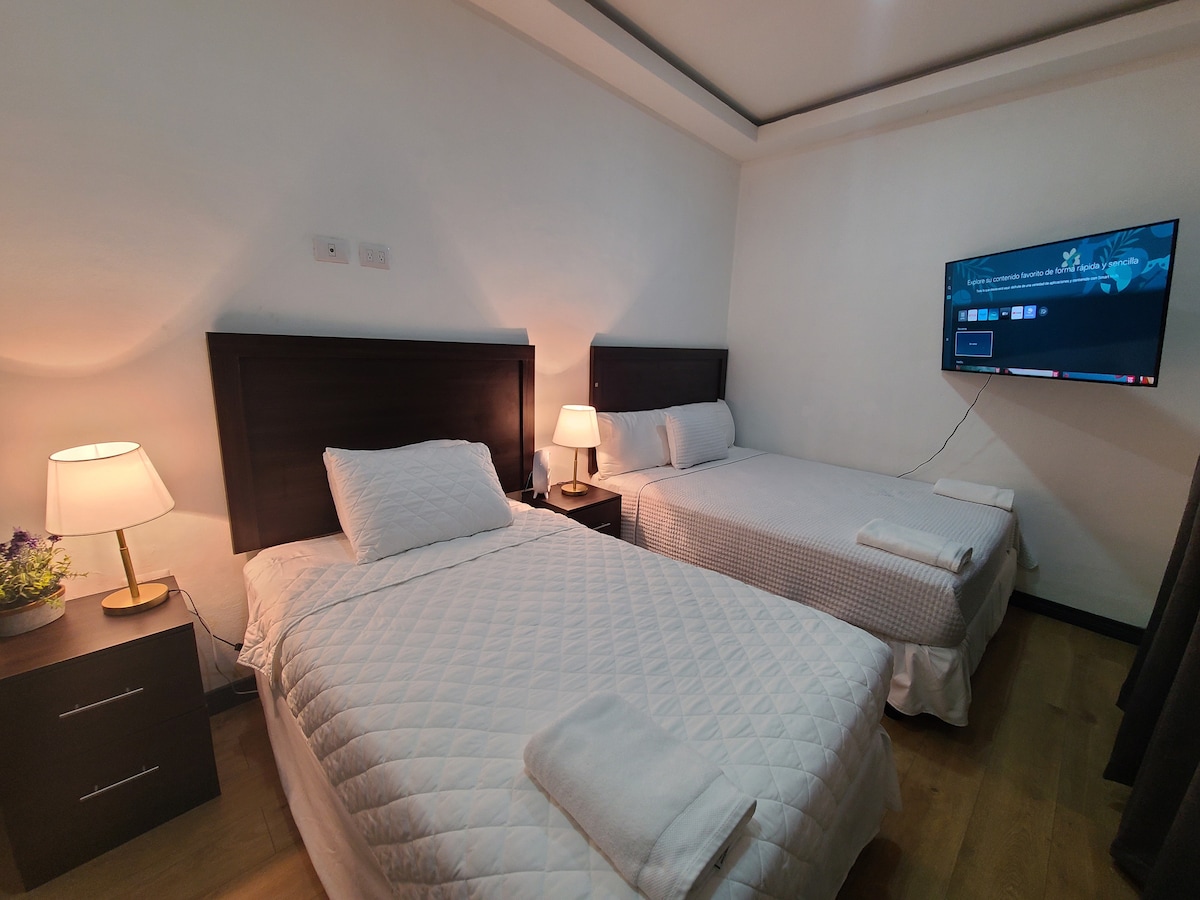 Diseño elegante, a/c; cerca de atracciones, restaurantes, hospitales y tiendas. Alojamiento privado, seguro, - Sala con baño social, sofá cama y smart TV - 1 habitación con litera Queen, baño dentro de la habitación - Barra desayunadora para disfrutar tu comida de Delibery, refrigerador bar (Debes de encenderlo al llegar ) microondas Especial esmero en la limpieza. Te ofrezco papel higiénico, jabón para cuerpo,shampoo, acondicionador Parqueo (Externo) Escritorio portátil con rodos