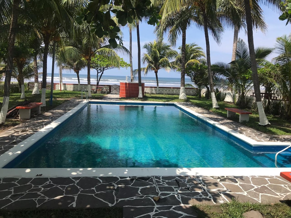 Beach front family house in Playa El Cuco, in San Miguel, El Salvador. Up to 5 rooms with AC, bathrooms in each room, pool, hammocks, and full equipped kitchen. Located just a few kilometers from top surfing spots. House holds up to 15 people. Rate is for 11 beds in 3 rooms. Extra rooms can be open for an additional rate.