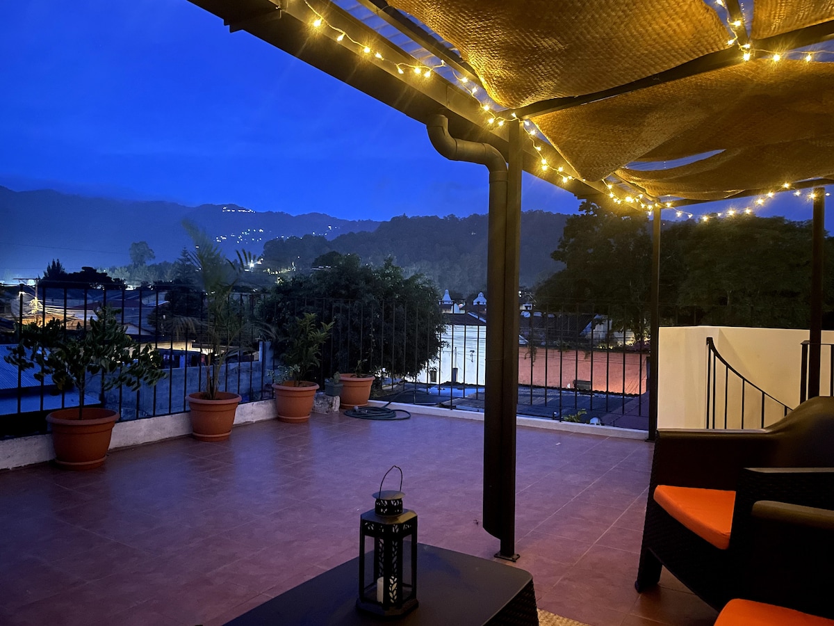 Casa Colmena is a 2 bedroom, 2 bathroom home a 15 minute walk to Parque Central. It also has a beautiful rooftop terrace with views of all three volcanos. Starlink WiFi as of April 2024. Street parking directly outside of the house is available, more secure parking can be arranged nearby for an additional cost.
