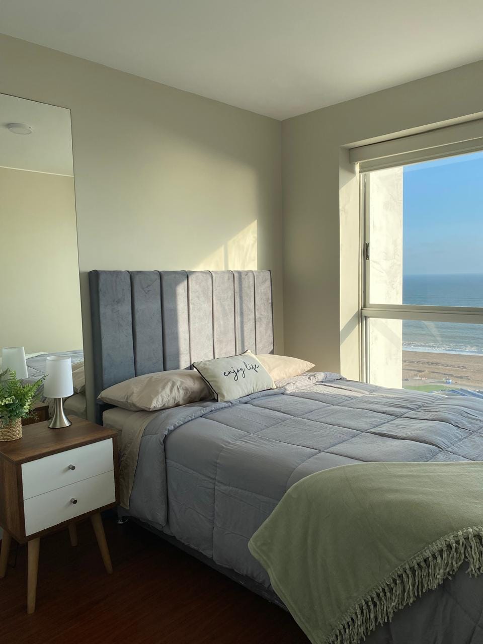 Departamento con hermosa vista al mar, cerca al Aeropuerto y de los mejores lugares turísticos de Lima, amoblado con todas las comodidades. Consta de: Sala, escritorio, Kitchenette, 1 Dormitorio con cama queen, 1 baño y una Terraza con vista al mar. Con áreas sociales: Sala de Cine, Sala de juegos, Patio con Fogón, Lavandería, Sala de Adultos, Gimnasio, Sauna, Ambientes de Parrillas, Terraza con Tina de hidromasajes, Piscina para adultos y niños.