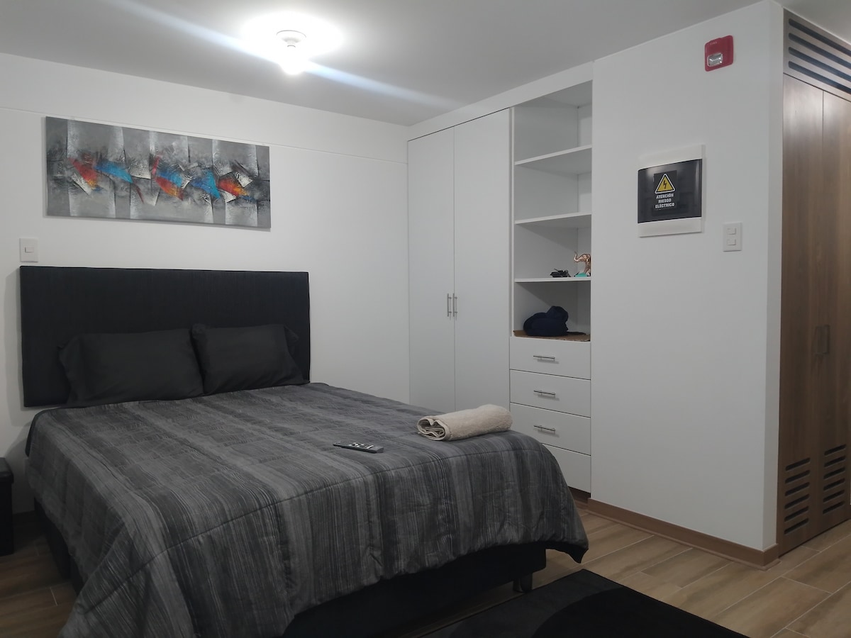 Disfruta de este mini departamento nordico, acogedor y con aire acondicionado para el verano y así tu estancia sea comoda, además esta a 10 minutos del aeropuerto internacional de Lima Perú, a 5 minutos a pie esta del centro comercial Mall Plaza Bellavista, ahí hay restaurantes, bancos, casa de cambio, cine, tiendas, supermercado, etc. también esta cerca a la Universidad San Marcos y Del Callao, zoológico, polideportivo del Callao, clínicas además aledaños a otros distintos turísticos.