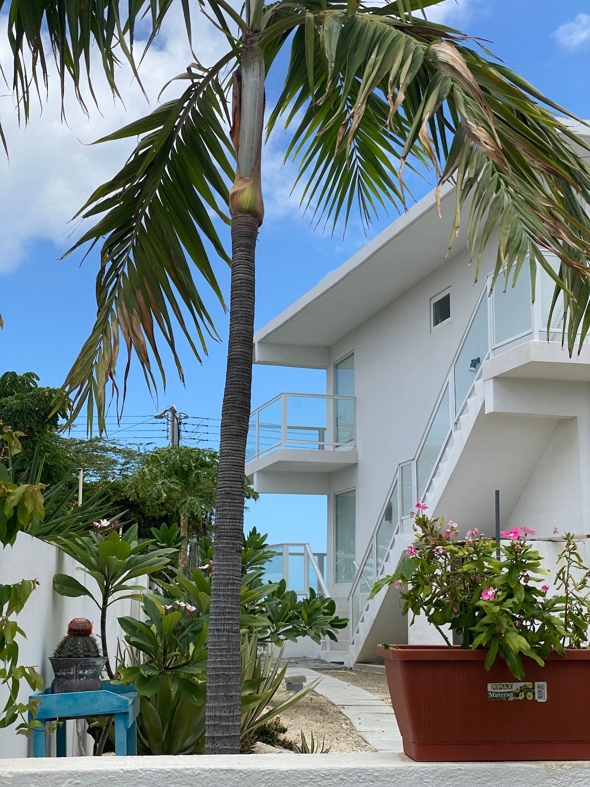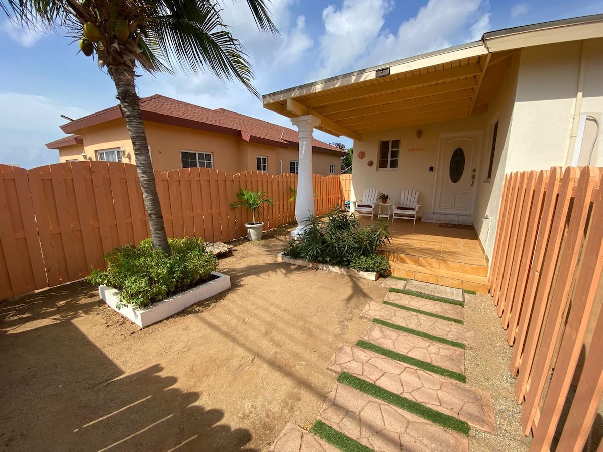 Blissful Hilltop Haven This cozy and peaceful “Tiny house” style apartment with a beautiful garden is situated in San Nicolas on a hilltop with a view of the sea. It is away from the busy high-rise resorts area, in a safe and up-scale neighborhood on the east side of the island. The beaches on this side of the island are only 8 to 10 minute away. It is a haven for anyone who needs to relax and recharge from a hectic lifestyle and/or for people who want to have an exciting island experience.