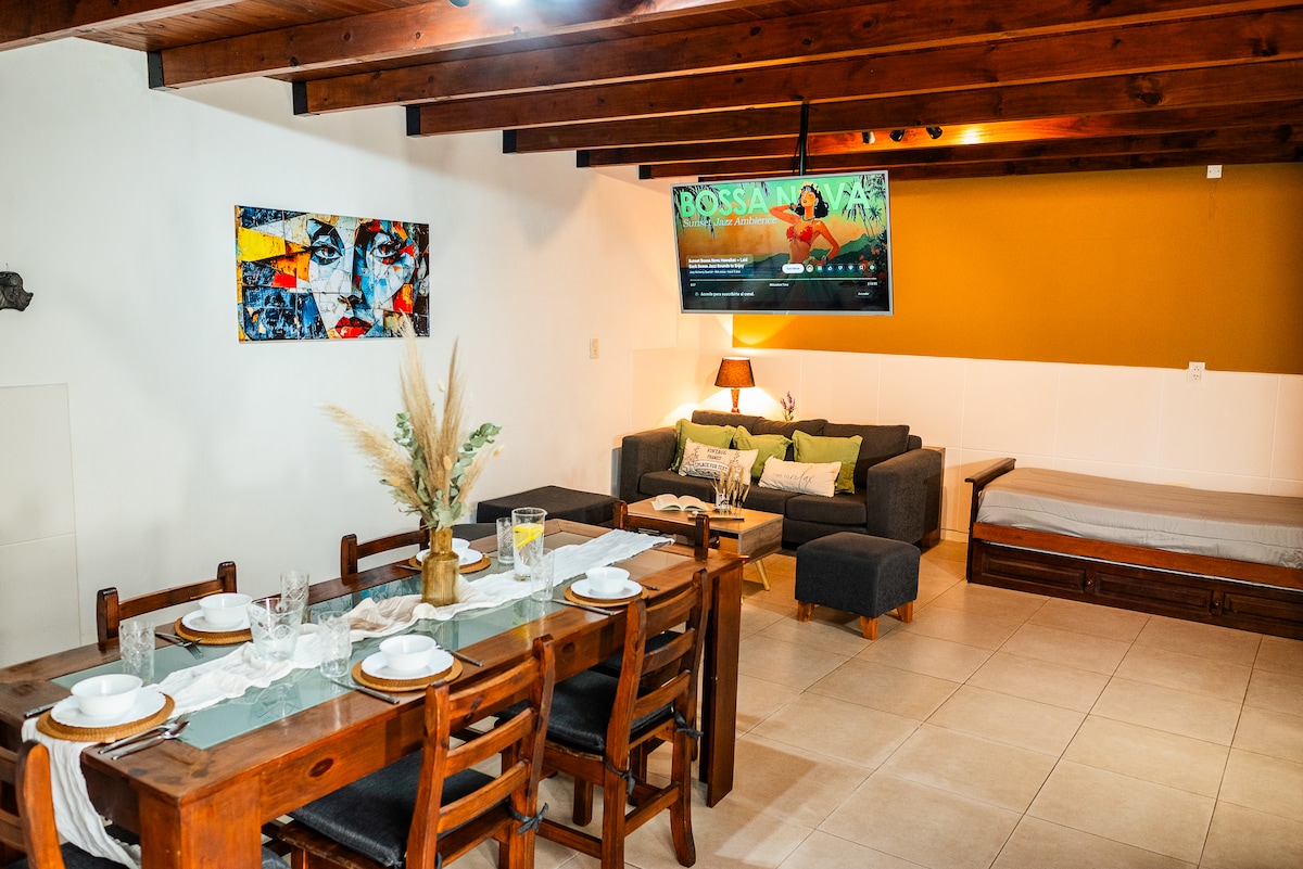 Disfrutá de la comodidad de este alojamiento a pocas cuadras del microcentro, ideal para viajes de trabajo, escapadas en pareja o pasar unos días a conocer la ciudad. El espacio cuenta con: • 🛏️ Habitación con cama matrimonial • 🛋️ Sofá cama en el living para huéspedes adicionales • ❄️ 2 aires acondicionados frío/calor • 🍳 Cocina equipada • 🚿 Baño y lavamanos separados • 📺 WiFi y TV • 🚗 Cochera privada y techada para autos, no camionetas grandeos