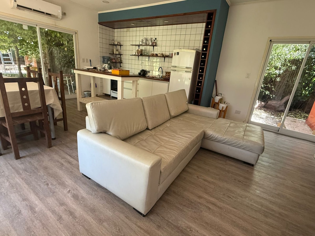 Nuestra casa se encuentra en el corazón de la ciudad de Villa Ramallo, en un Barrio llamado Amuchoca que se caracteriza por su tranquilidad, estamos a 5 kms del Río Paraná. Es la comodidad de estar cerca de todo, pero también la tranquilidad de un espacio privado. Contamos con una casa cómoda y apta para 6 personas, el mayor atractivo en temporada de verano es nuestro patio verde y su mini piscina con Hidro masajes y en invierno el living tiene una estufa a leña con fuego a la vista.