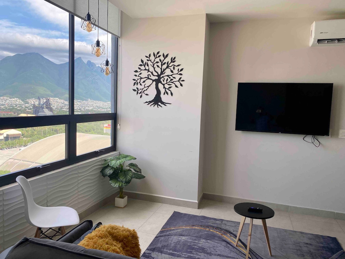 FACTURAMOS - Agua 24/7 - 3 personas ¡Bienvenido a Puntacero! Esperamos recibirte en uno de nuestros Airbnb más lujosos de Monterrey. Departamento con acabado excepcional y vista al cerro de la silla. ¡Ubicación única! Wifi, Smart TV, climatizado, 1 cajón de estacionamiento. Ideal para ejecutivos, familias y turistas. Seguridad 24/7, 3 elevadores, EXCELENTES AMENIDADES. Plaza comercial con restaurantes y un OXXO cerca. Cama King y Sofá cama Matrimonial.
