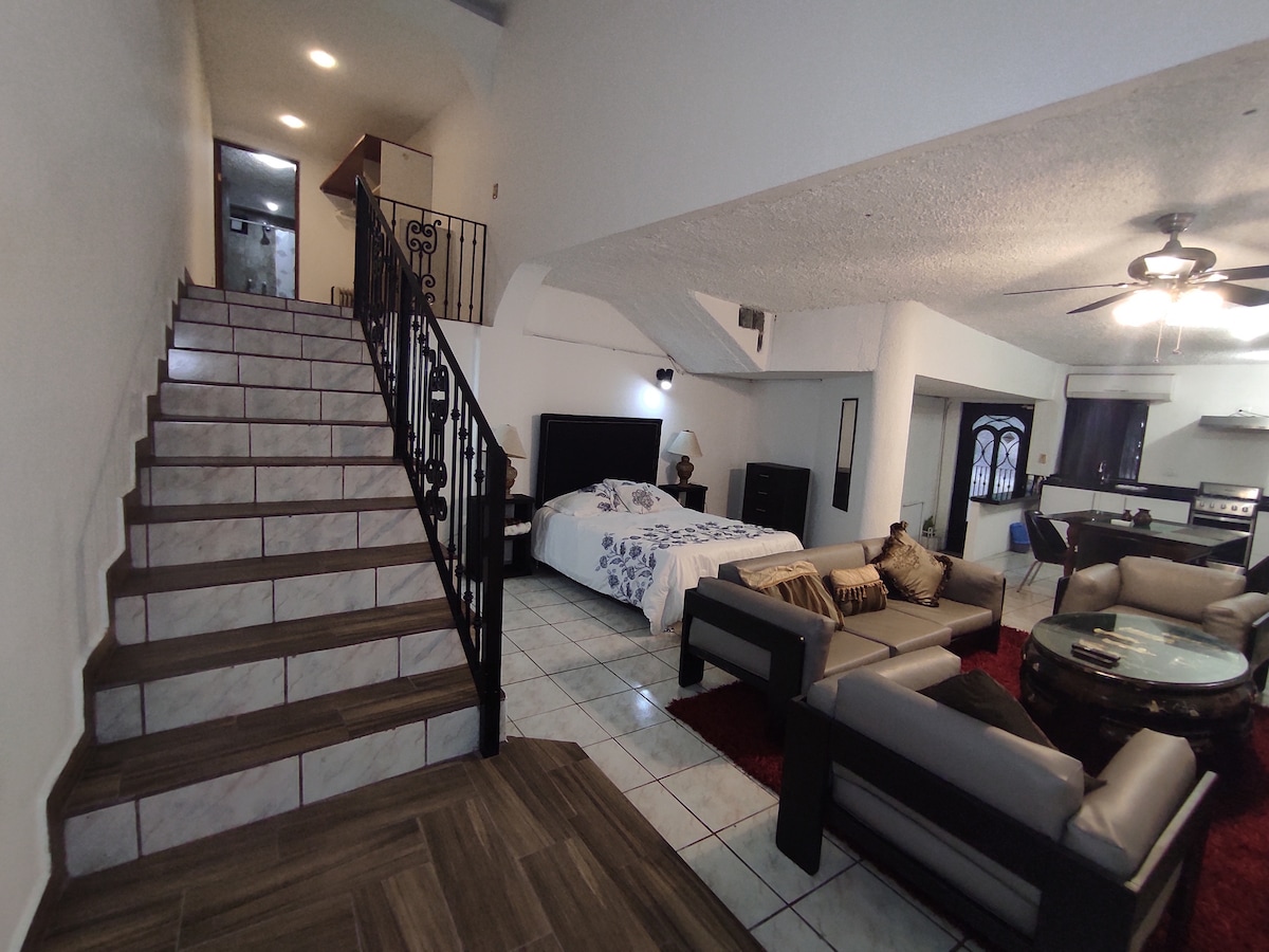 Loft privado e independiente dentro de una casa, completamente remodelado, ubicado al sur de Monterrey. Cuenta con entrada independiente, cama matrimonial, baño completo, frigobar, cafetera y mesa alta ideal para comer o trabajar. No cuenta con TV ni cocina equipada. En colonia tranquila y segura sobre Av. Garza Sada, con fácil acceso a la ciudad. Patio compartido, zona arbolada, ambiente silencioso y a una cuadra del Parque Natural Río la Silla.