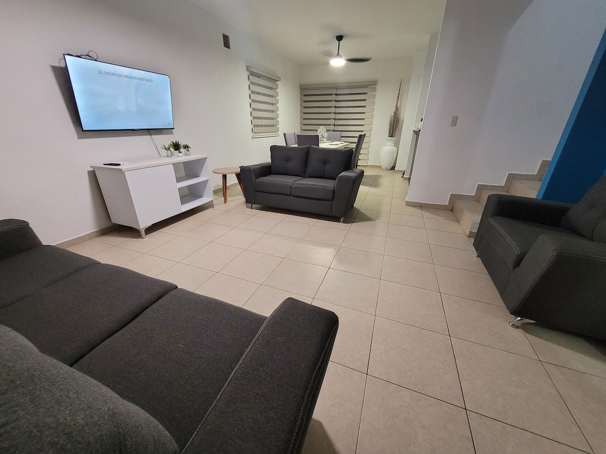 Facturamos. Escápate a una casa cálida, moderna y recién renovada estilo boutique. A 19 min del aeropuerto y 35 min del centro de Monterrey, en privada con vigilancia 24/7, cerca de parques industriales y tiendas. Disfruta baños boutique, recámaras A/C y calefacción, pantallas mini LED de 75” con sonido Bang & Olufsen en sala y recámara. Apps de streaming, Xbox, juegos de mesa y patio con TV, asador y muebles exteriores. Muebles con piedra Saint Laurent. Todo para que vivas una gran experiencia