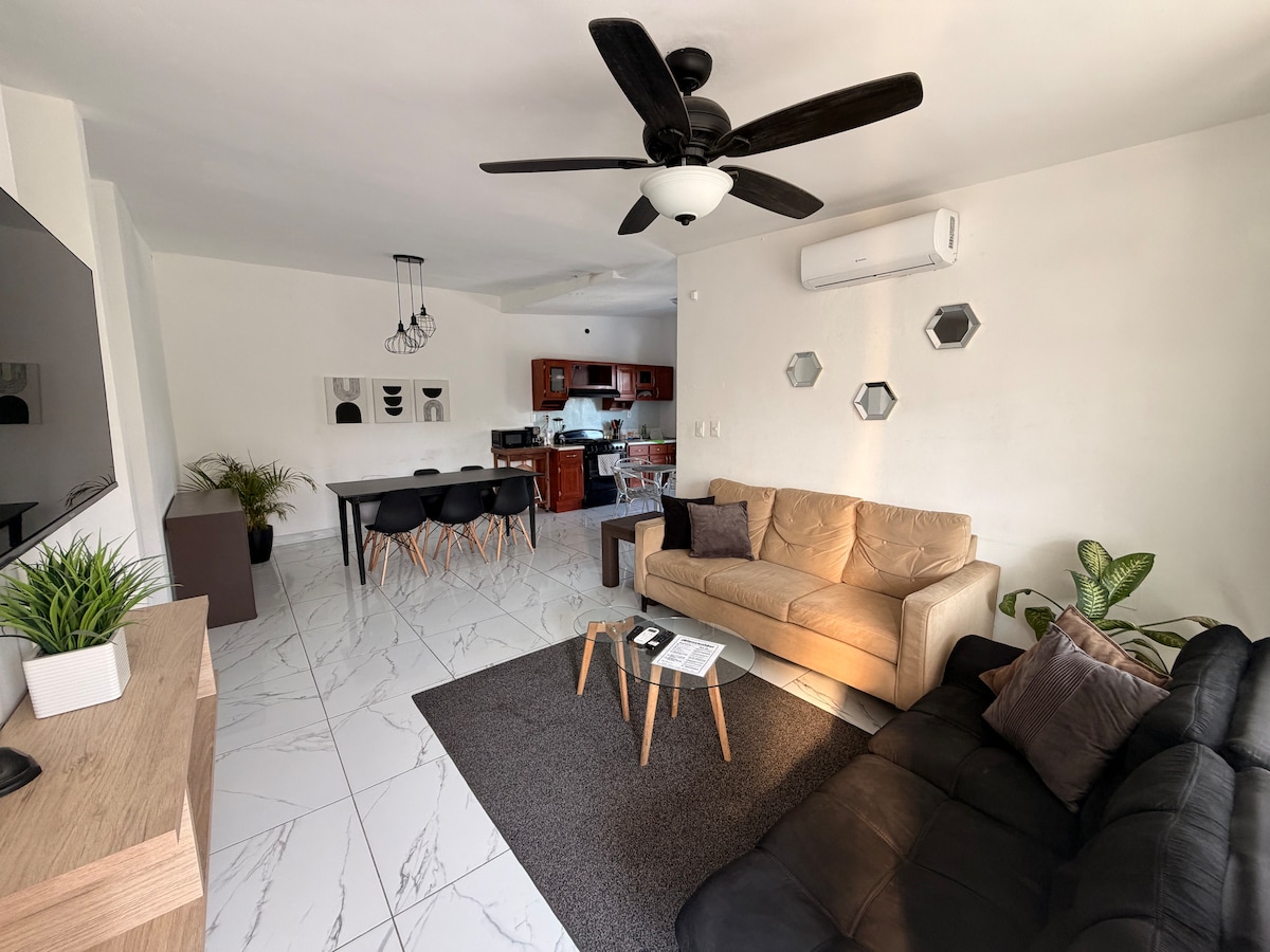 Hermoso departamento de ambiente familiar con estilo moderno y acogedor! excelente opción para descansar y disfrutar. Equipado al 100%, ropa de cama, almohadas y colchones de alta gama para ofrecer el máximo confort y descanso. Cuenta con cocina completa, estufa, horno, refrigerador, microondas, licuadora. Excelente ubicación frente a zona industrial y estudiantil. Cerca de importantes centros comerciales, a 20 min del aeropuerto, a 8 km de Parque Fundidora, Cintermex y zona centro de Monterrey.