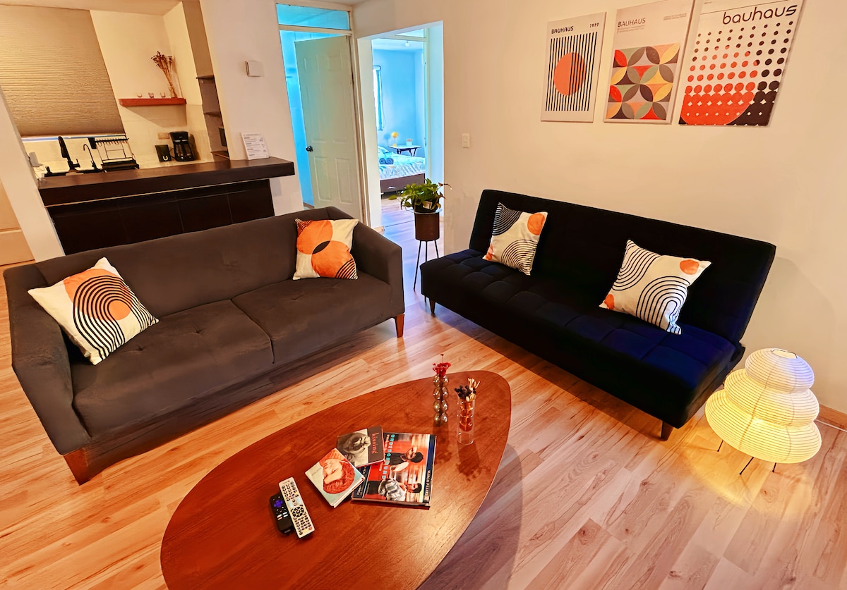 Departamento entero, en recámara tiene cama King Size y 2 sofá cama, aire acondicionado frio/calor, TV, closet y cajoneras. Además, tiene exclusivamente para ti: sala con 2 sofá cama, baño completo, barra comedor, cocina (con refri, estufa, micro ondas, horno, cafetera, nutribullet, sartenes, platos, etc.) Wi-fi rápido de 80MB, TV en sala.