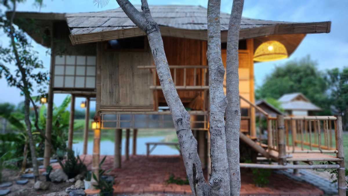 Our new wooden guest house refurbished from old rice barn on stilts. Features a full kitchen downstairs. Main floor has a/c and a hot water shower. The balcony overlooks groves of bamboo beside a creek and rice fields. Great Thai and western food close by along with coffee shops, fruit vendors and one of Thailands famous handicraft villages. Please check out my other guest houses this is one of 6 in total on the property creating a small wooden village set in a beautiful garden setting.