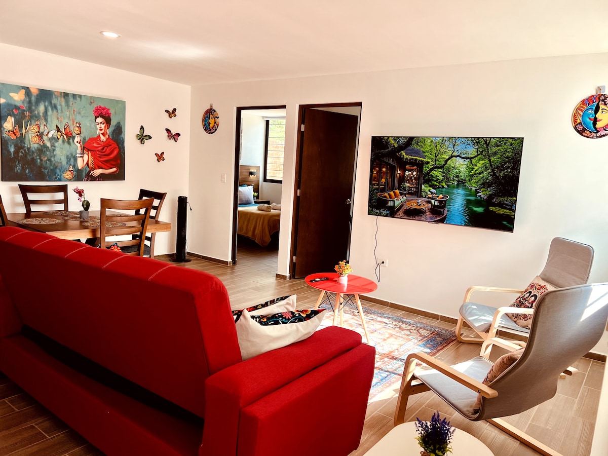 Cozy loft in a private gated community, perfect for relaxing after a long day. Upstairs you'll find a double bed, large closet, garden-view windows, and a private terrace. Downstairs features a fully equipped kitchen, full bathroom, washer/dryer, a sofa bed, and a lounge chair. Ideal for short or extended stays. If you want to experience true Mexican hospitality, this is the perfect place.