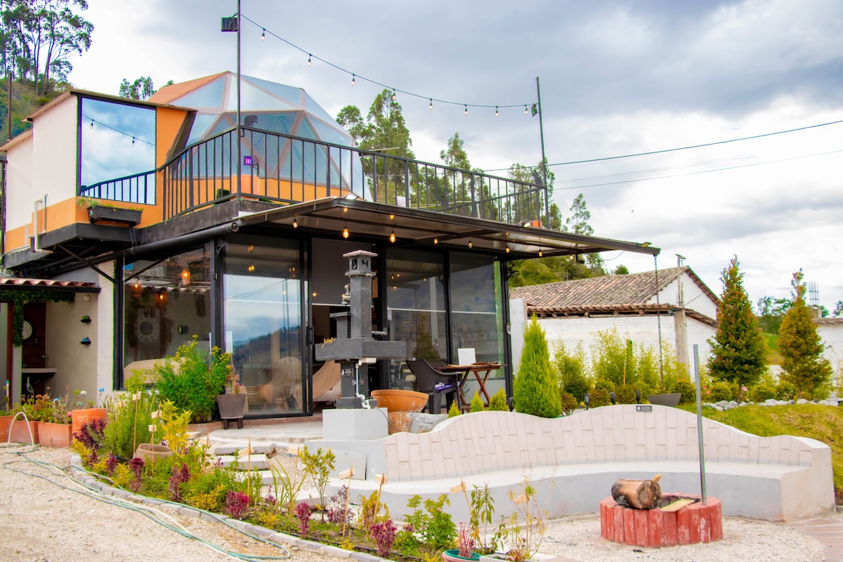 Lovely suite with panoramic view of the mountains, spacious and comfortable rooms and social areas, outdoor pool and jacuzzi, WIFI, fully equipped kitchen, gift basket, terrace and sunshade. Located in San Jose de Chaltura, 15 minutes from Ibarra, 1:30 hours from the International Airport, Quito. This Farm Home was designed to help you connect with nature, rest and renew, surrounded by a unique landscape, exclusive for you. The property has 6 hectares of gardens, fruit trees and avocado trees.