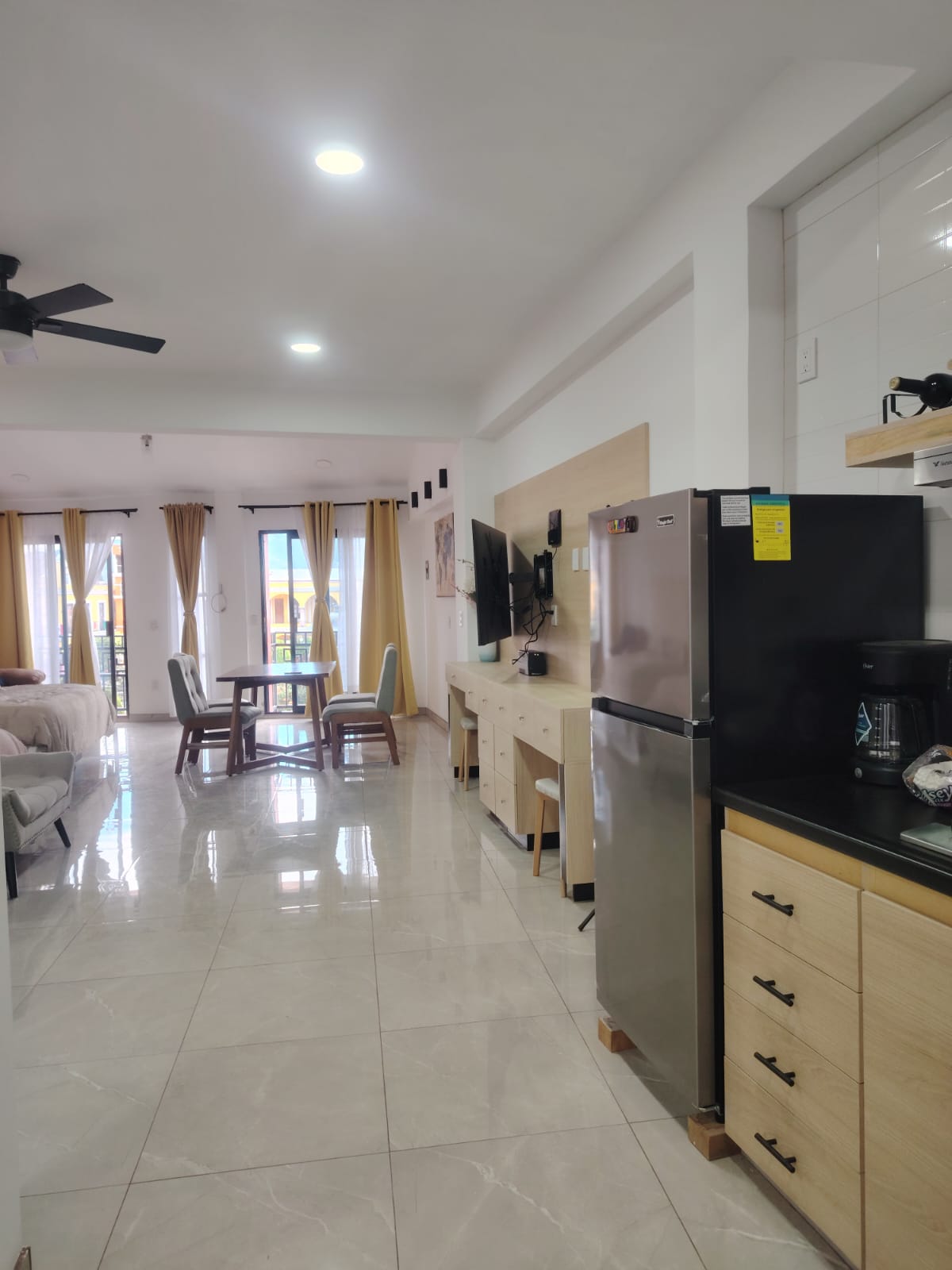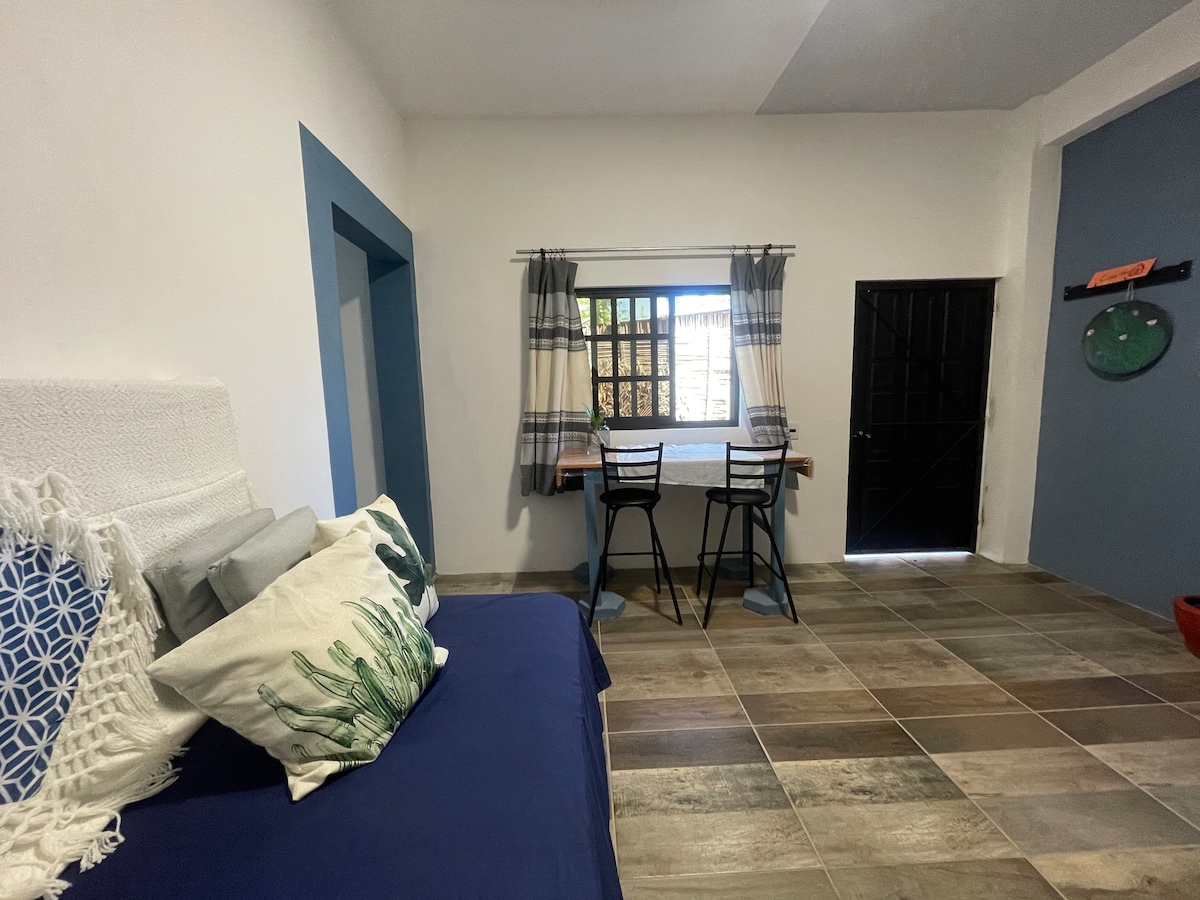 Un espacio bastante acogedor dentro de una propiedad familiar que cuenta con un refrigerador con suficiente espacio para colocar tu comida, y prepararte algo fácil y ligero. Una cama matrimonial y un sofá cama hasta para 3 huéspedes