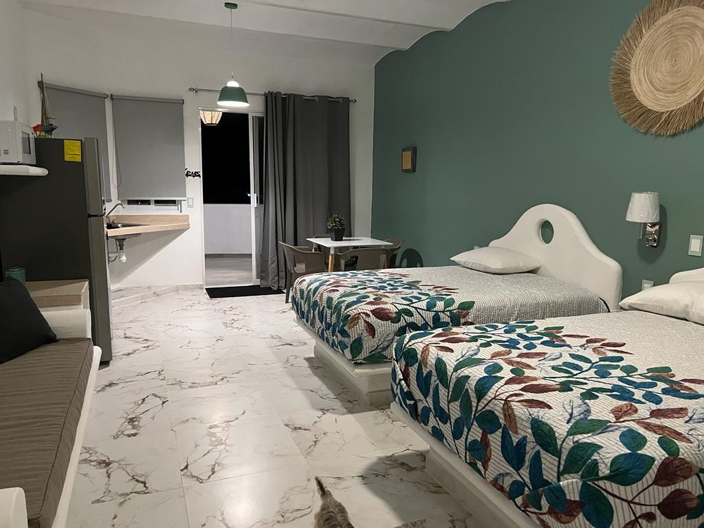 Habitación privada en un pequeño hotelito de 12 habitaciones, excelente ubicación, en Sayulita, Nayarit a solo una cuadra de la playa, media cuadra del centro, a unos pasos del mercado Organico del Pueblo. Tiene baño privado con agua caliente, ventilador , television con satélite, Instalaciones completamente nuevas.