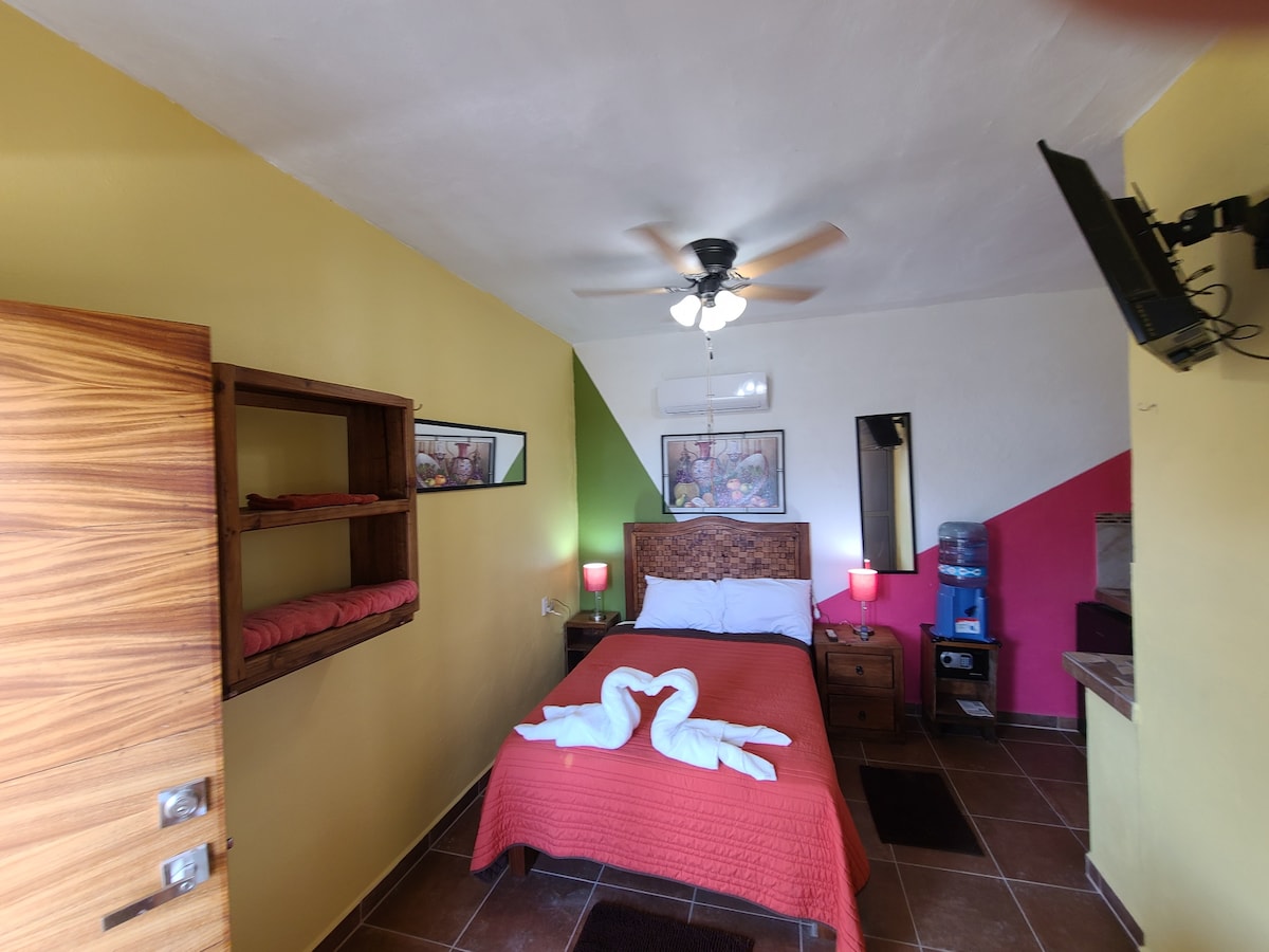 These street facing rooms for ONE GUEST with matrimonial Bed come with a smart TV and laptop friendly workspace, wifi, USB Ports and outlets, and hot showers. Our property concept is efficient guest rooms with a focus on the common areas for guest lounging. Includes towels and linens, in-room A/C, memory foam mattress topper, and Complimentary Cowork Hot Desk usage. A microwave and free morning coffee are available in the hotel lobby. Mini-fridges $50 pesos/day on request