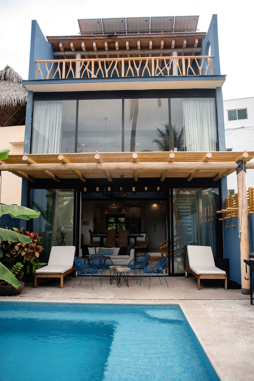 Make unforgettable memories at this unique and family friendly place. This home away from home, has an fully equipped kitchen, 3 bedrooms, 3 bathrooms, with modern air conditioning, 12 ft ceiling with modern fans in each room, a small (cool)dipping pool, rooftop terrace, and a patio with palapas. It's located right on the main street near convenience stores, restaurants, shops, and pharmacies. 10 mins stroll to the beach for breathtaking sunsets and sunrises. Or hit the waves for surfing ride.