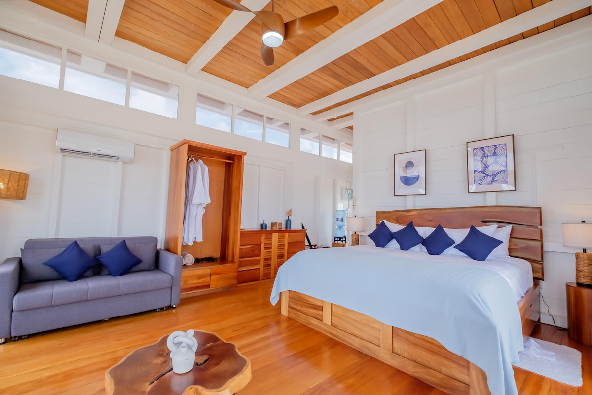 The King Bungalow Suites are set in private standalone buildings for peace and privacy. Inside, you’ll find a serene sleeping area with a king bed and a modern bathroom with a walk-in shower. The main room has a kitchenette, dining nook, and living area. Vaulted ceilings of rich Belizean hardwoods and expansive windows invite natural light and frame the surroundings. Outside is a spacious porch with a built-in cushioned bench. Each suite offers partial ocean views for a truly tranquil escape.