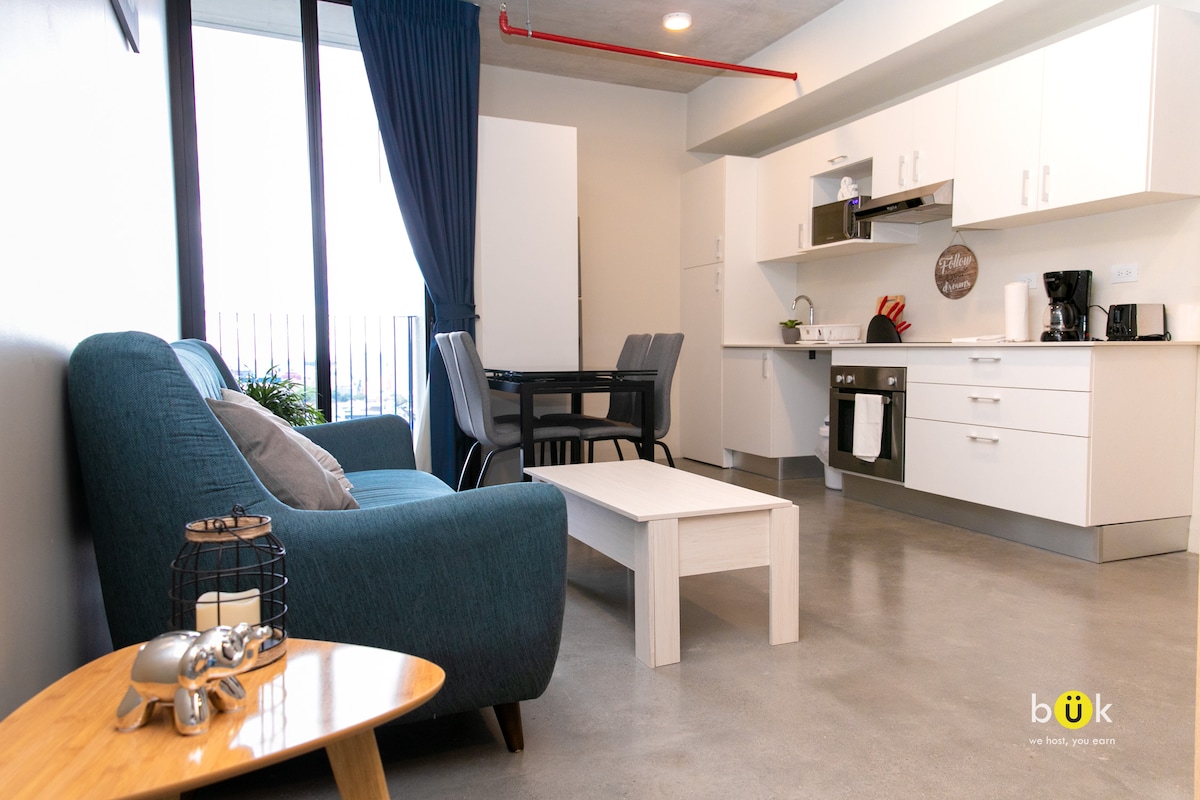 Te ofrecemos un aparta en un piso 18, con vista panorámica y brisa fresca. Este loft moderno combina estilo y comodidad con un balcón integrado, cortinas blackout para mayor confort, wifi y parqueo privado. En el piso 25 contamos con una piscina infinita, área de iworking y más. Estamos ubicados en una zona segura y céntrica de Curridabat, donde tendrás todo a tu alcance. Como Súper Anfitrión Top 10% en Costa Rica, garantizo atención rápida y dedicada para que tu estadía sea inolvidable.