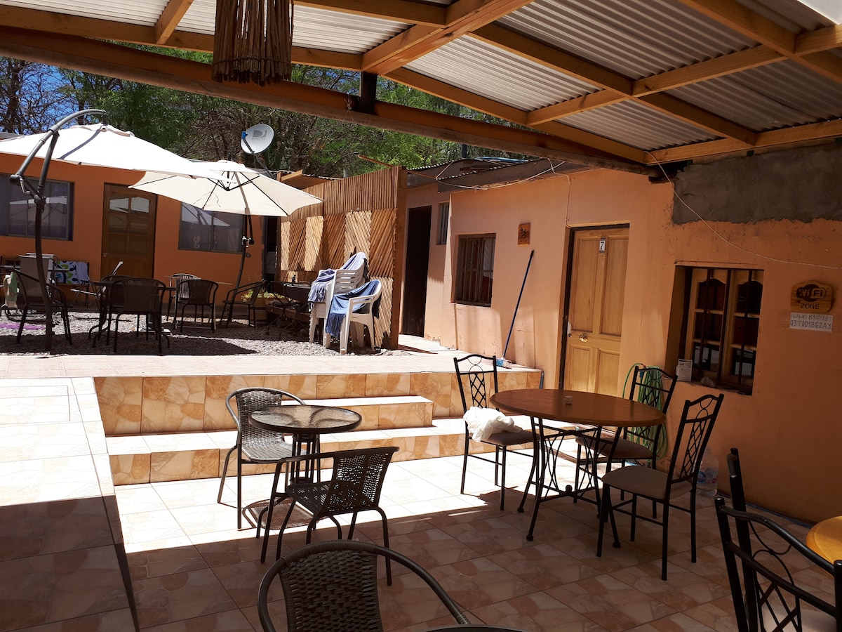 Disfruta de una linda estadía en el corazón del místico San Pedro de Atacama. Estamos ubicados a solo dos cuadras del centro de la ciudad caminando. Ofrecemos comodidad para compartir en familia con espacios compartidos de cocina, quincho, espacio al aire libre y área de terraza para descansar y relajarse. Contamos con la opción de agregar una cama extra por un recargo adicional. También tenemos estacionamiento privado y área de camping para motorhome.