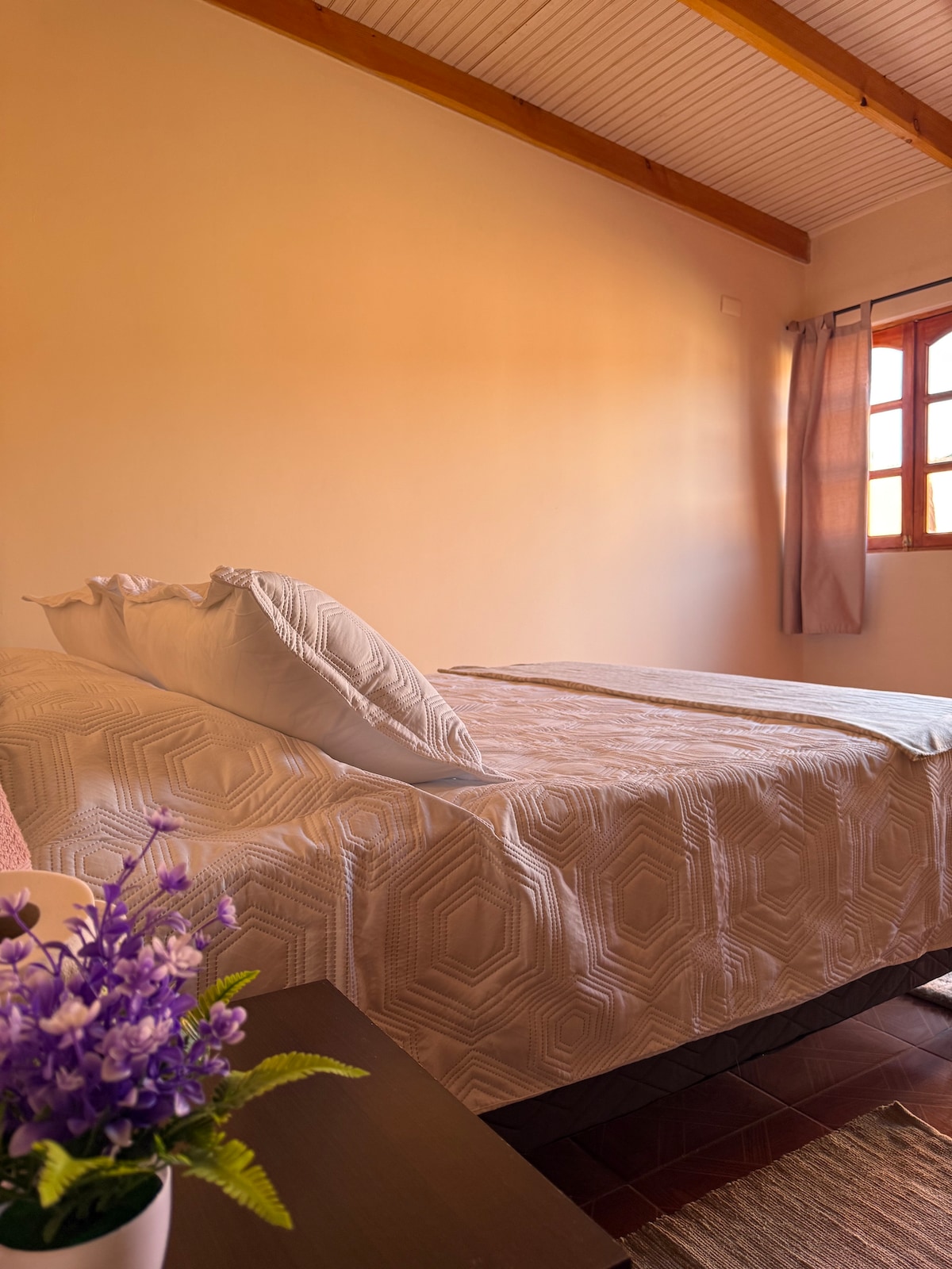 Te invitamos a hospedarte en nuestra encantadora habitación matrimonial, que además cuenta con una cama single adicional, perfecta para parejas o pequeños grupos. Disfrutarás de un baño privado y una entrada independiente, garantizando la máxima comodidad y privacidad. Cada mañana, podrás disfrutar de un desayuno incluido, perfecto para comenzar tu día con energía.