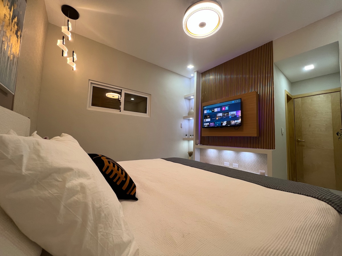 Vive la experiencia de un espacio moderno y céntrico, a solo dos calles del Estadio Tetelo Vargas y supermercados locales y a 15 minutos de las hermosas playas de Juan Dolio. El apartamento ofrece aire acondicionado tanto en la sala como en el dormitorio, que cuenta con una cómoda cama king size, mientras que la sala dispone de un sofá cama full. Además, disfrutarás de Wi-Fi, una cocina totalmente equipada y un área de lavado, diseñado para que tengas una estadía cómoda e inolvidable.