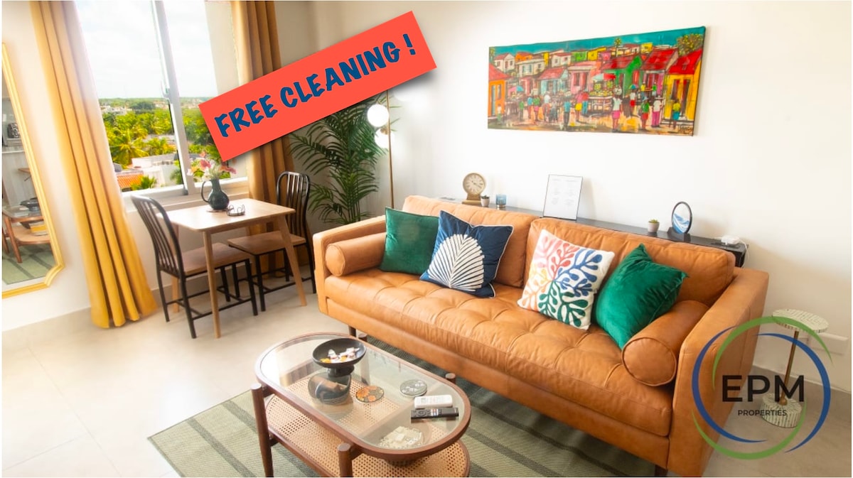 This luxurious beachfront apartment is located at Playa Nueva Romana South Beach. It is nicely decorated so you really feel the caribbean vacation vibes. The apartment has everything you need to make your stay pleasant. It’s fully air-conditioned, has a comfy queen bed, fully equipped kitchen and the living room space with a 55-inch TV. Full access to Pool, Gym and outdoor dinning / bbq / Pizza oven share area.
