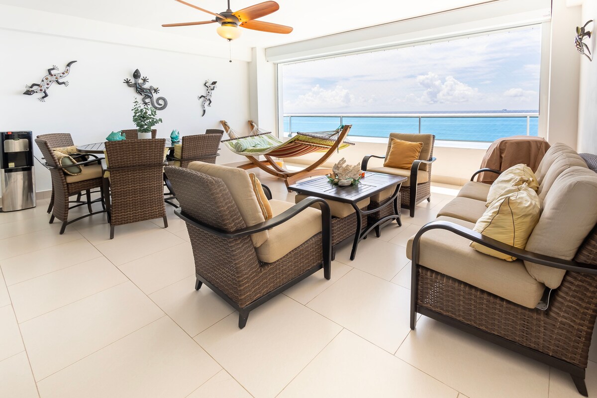 Despierta en el piso 9 con el océano frente a ti. Nuestra terraza con hamaca y comedor al aire libre te da una vista sin igual sobre Las Olas y el Caribe. 2 habitaciones con A/C, cocina equipada, WiFi, parqueo techado y seguridad 24h. Acceso a piscina, bar de playa, snack bar, área recreativa y playa privada del residencial. ¡A 20 min del aeropuerto y rodeado de restaurantes!