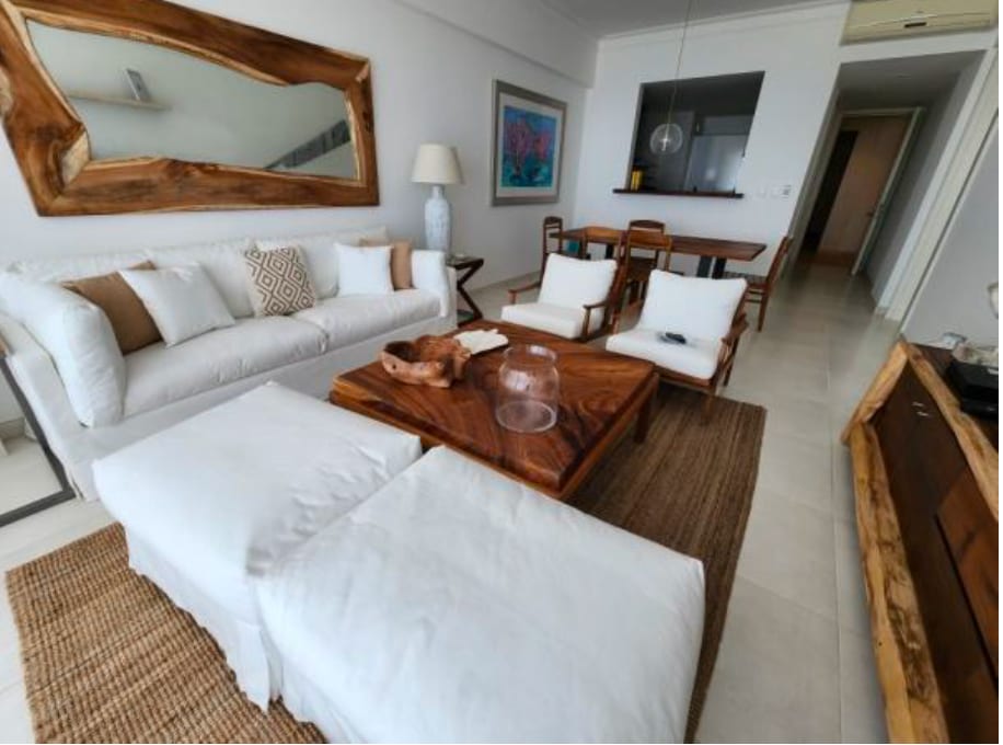 Stylish apartment with 2 bedrooms, a service room, and private bathrooms. Fully equipped kitchen, spacious terrace with protective mesh, 2 TVs, Wi-Fi, washer, dryer, air conditioning, and ceiling fans. Perfect for families or groups. Club Hemingway offers 4 swimming pools, 4 restaurants, a church, tennis and padel courts, a soccer field, gym, and a Clubhouse with a movie theater. Includes cleaning service twice a week, 24/7 private security, and access to an exclusive beach.
