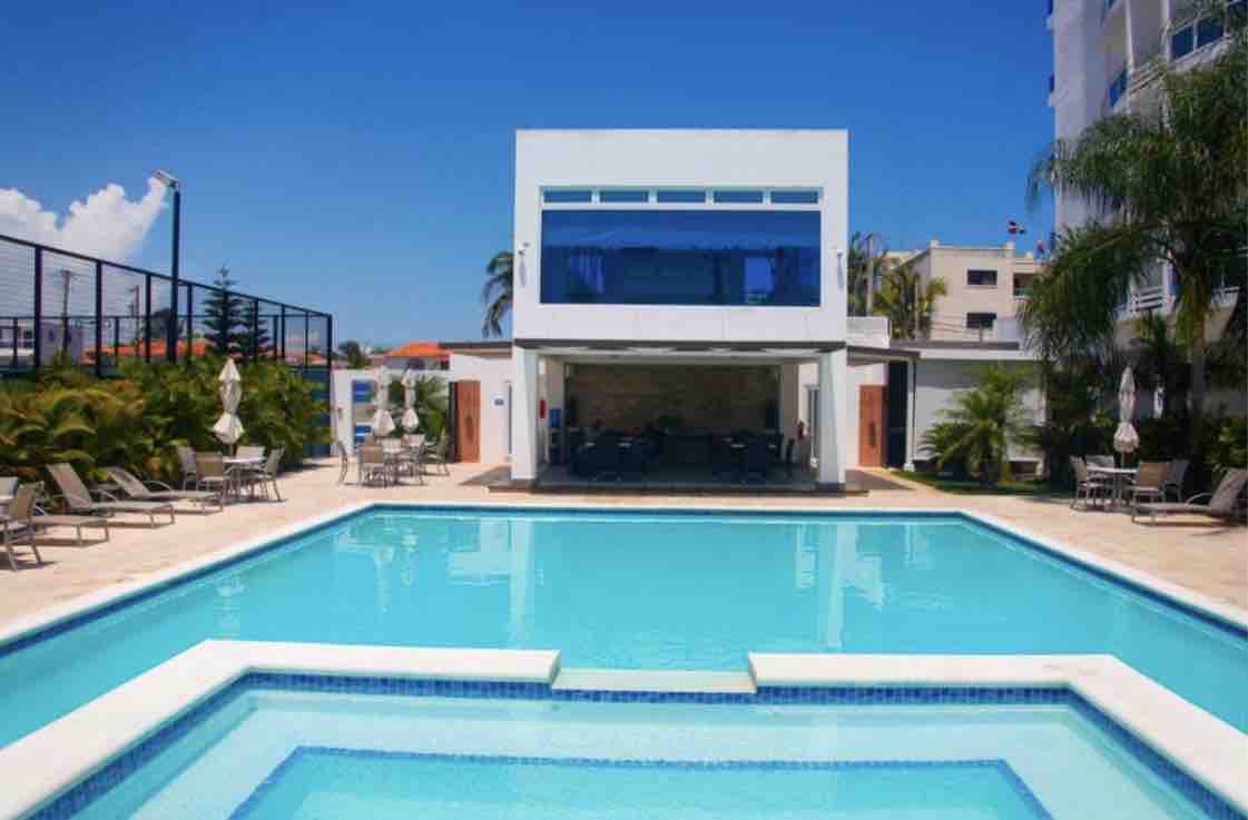 Blue Marine located at Torre Las Velas, Juan Dolio beach, is provided with a fully equipped kitchenette, Air Conditioning bedrooms, a balcony, and Wifi. Elevators, gym, private pool with Jacuzzi, BBQ area, tennis court, children's recreation area, common laundry area, parking, and different amenities. In its environment, it has banks, restaurants, nightclubs