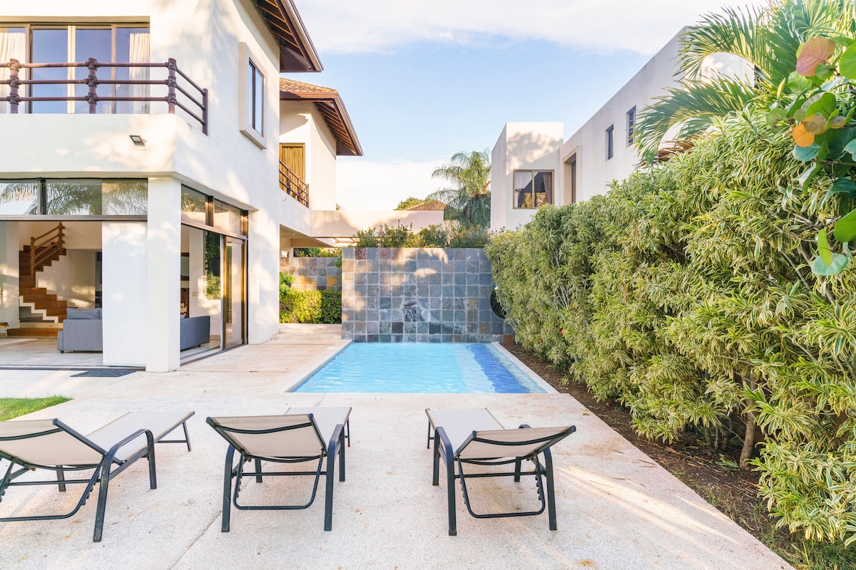 Step into luxury at our modern villa with designer interiors, a rooftop patio, and sun deck. Dive into your private pool and enjoy a 3-minute walk to beach club, you have full access to all beach facilities for free! Perfect for family or group getaways, plus, tee off at the prestigious PGA Ocean's 4 Golf course just 5 minutes away. The exclusive Playa Nueva Romana is 45 minutes from Santo Domingo Airport, an hour from Punta Cana, and only 20 minutes from La Romana Airport!