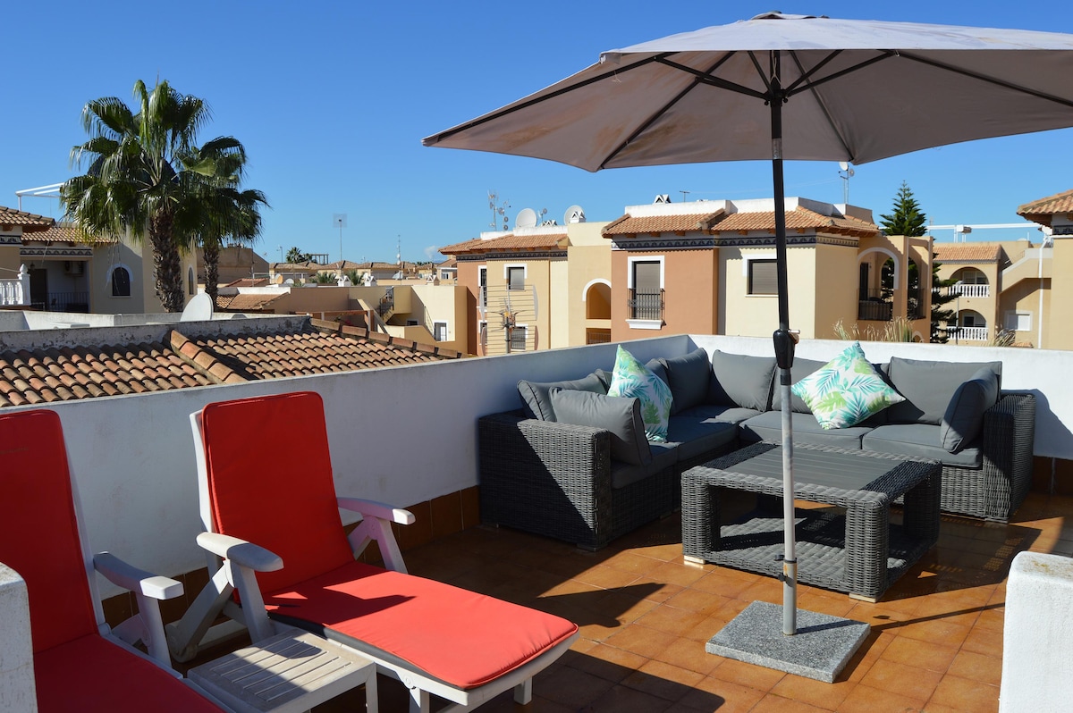 Een royale rijwoning in een rustige nieuwbouw wijk in Pilar de la Horadada. De woning is gelegen nabij de Rambla, een autoluwe zone van ongeveer 3 kilometer waar u wandelend en fietsend naar het strand kunt gaan. De woning heeft een zonnige gelegen tuin met privé zwembad. Een ruim balkon en privé dakterras. Op loopafstand vind u restaurants, café's en supermarkt. Ideaal om met de fiets het authentieke Spanje te ontdekken.