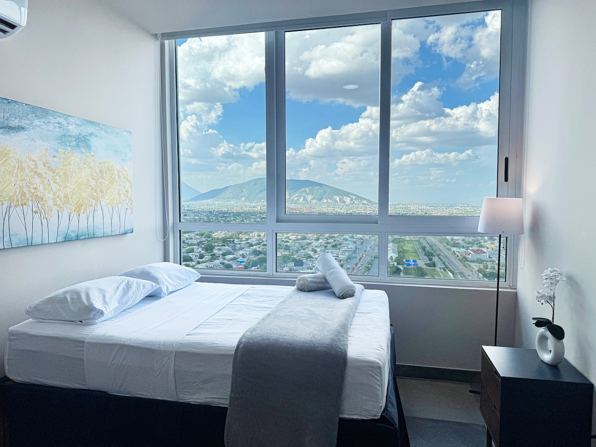 ✨ Experience Monterrey from Above 🌆 Relax in our modern 2BR/2BA apartment in San Pedro with stunning panoramic views. Two queen beds, 2 full bathrooms, fully equipped kitchen, A/C, fast WiFi, washer-dryer, parking & 24/7 security. Perfect for business, medical or leisure trips: minutes from top hospitals, Showcenter, shopping centers and the best restaurants. Ideal for short or long stays, blending the comfort of home with the boutique experience only San Pedro can offer.
