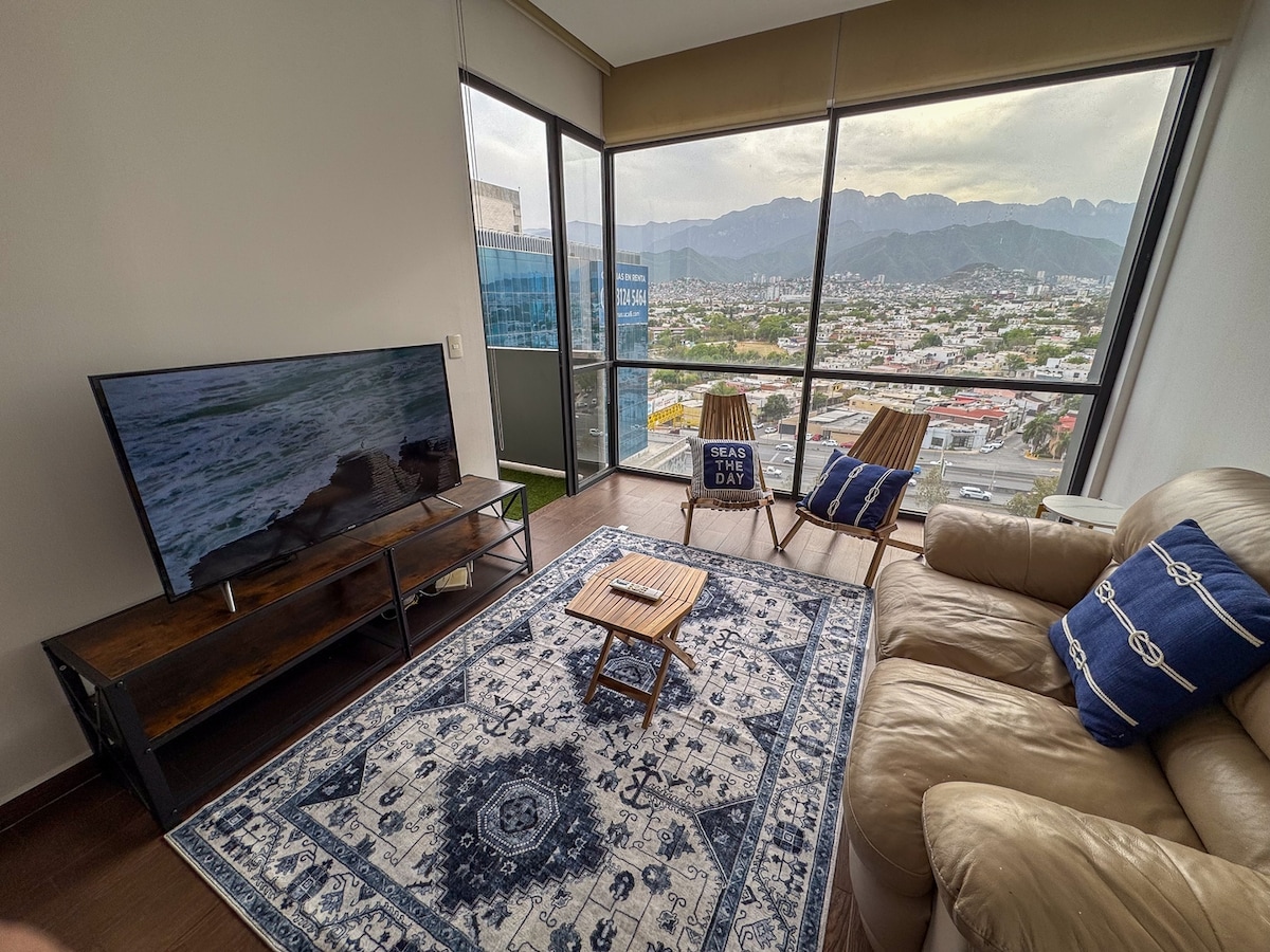 Precioso departamento totalmente remodelado en la mejor zona de san Pedro Garza García. Prácticamente todo nuevo (camas, sábanas, colchones, persianas, refri, lavadora, secadora, sala, comedor, electrodomésticos, climas). Cuenta con Wifi, smart TV con 80 canales, minisplit en cada cuarto y un lindo balcón con hermosa vista a la zona hotelera.