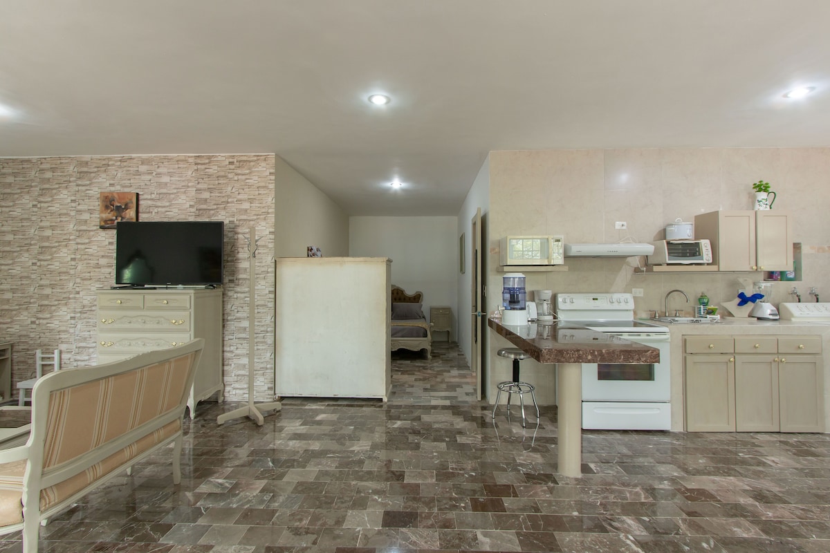 Es una estancia tipo Loft con Wi-fi 100 mgb/s con muebles de cedro tipo colonial. con baño completo y uno de tocador lo mas necesario para sentirse agusto. Cama king size, colchon inflable , comedor, sala dividida con biombo, Rustico TV. Netflix . Baño completo y uno de tocador .. cocineta ,refrigerador, clima,mini split 2 ton. closets amplios con cajonera, caja fuerte .