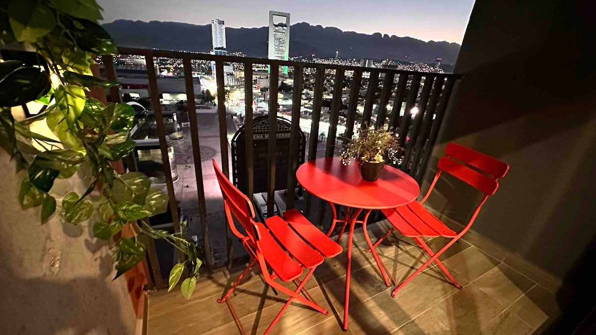 Despierta con una vista única del Cerro de la Silla en tu terraza privada. Disfruta un espacio moderno con alberca, gimnasio y cowork en el centro de Monterrey. Ideal para viajeros de negocio y escapadas urbanas. Wifi y climatizado Seguridad, 3 elevadores. Gimnasio, alberca con camastros y Co-Work. RECÁMARA: - Cama Matrimonial - Clóset - Baño ÁREA SOCIAL: - TV - Escritorio - Comedor 4 P. - Sofá - Escritorio y silla COCINA: - Completamente Equipada TERRAZA: - Mesa - 2 sillones