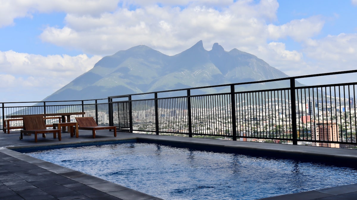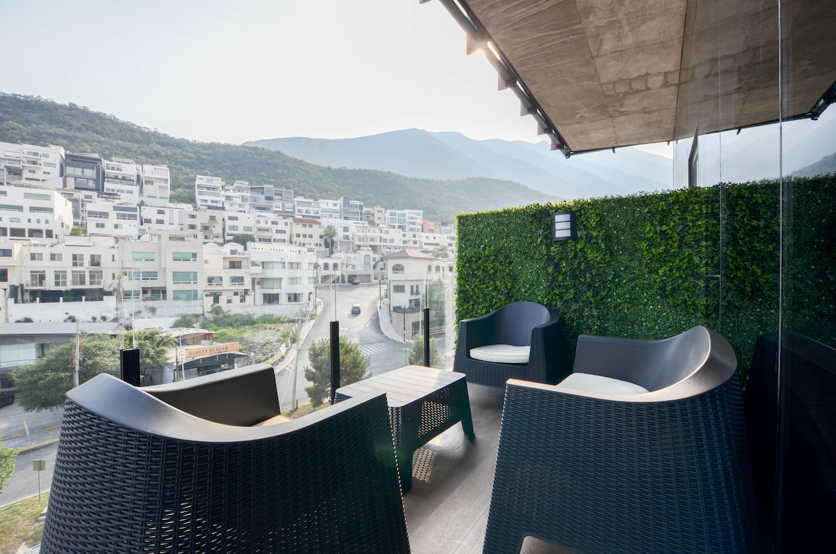 ✨ Experience Monterrey from Above 🌆 Relax in our modern 2BR/2BA apartment in San Pedro with stunning panoramic views. Two queen beds, 2 full bathrooms, fully equipped kitchen, A/C, fast WiFi, washer-dryer, parking & 24/7 security. Perfect for business, medical or leisure trips: minutes from top hospitals, Showcenter, shopping centers and the best restaurants. Ideal for short or long stays, blending the comfort of home with the boutique experience only San Pedro can offer.