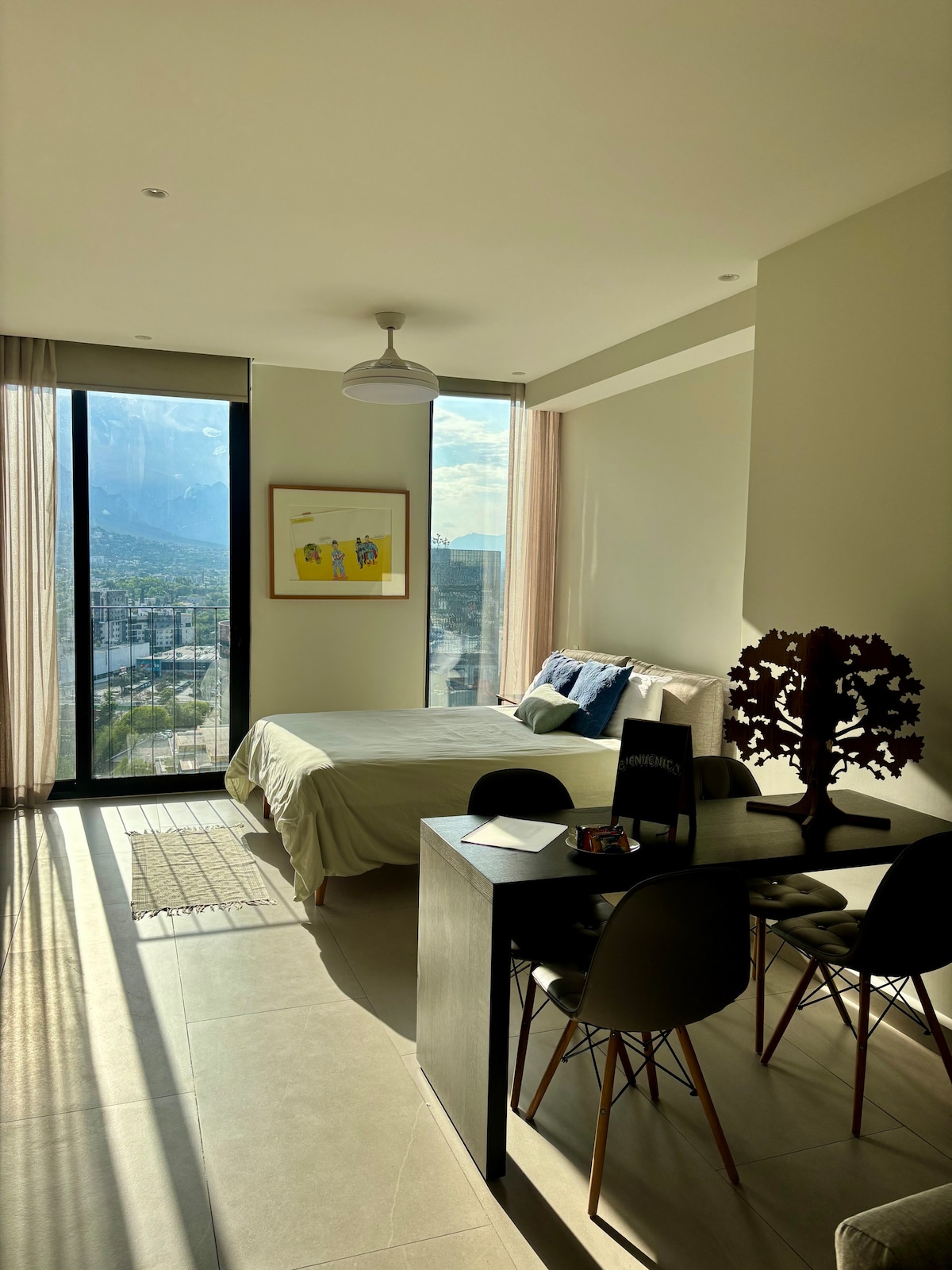 Ubicado en ARBOLEDA, exclusiva zona de San Pedro, el mejor lugar para vivir, en un área divertida y segura. Relájate en este loft con increíbles vistas a la montaña, ideal para tus viajes de negocios o simplemente para conocer lo mejor que tiene la sultana del norte por ofrecer. ✔ Alberca, gimnasio, kids room y game room. ✔ Centro de Negocios. ✔ Facturación completa (con comisiones de airbnb)