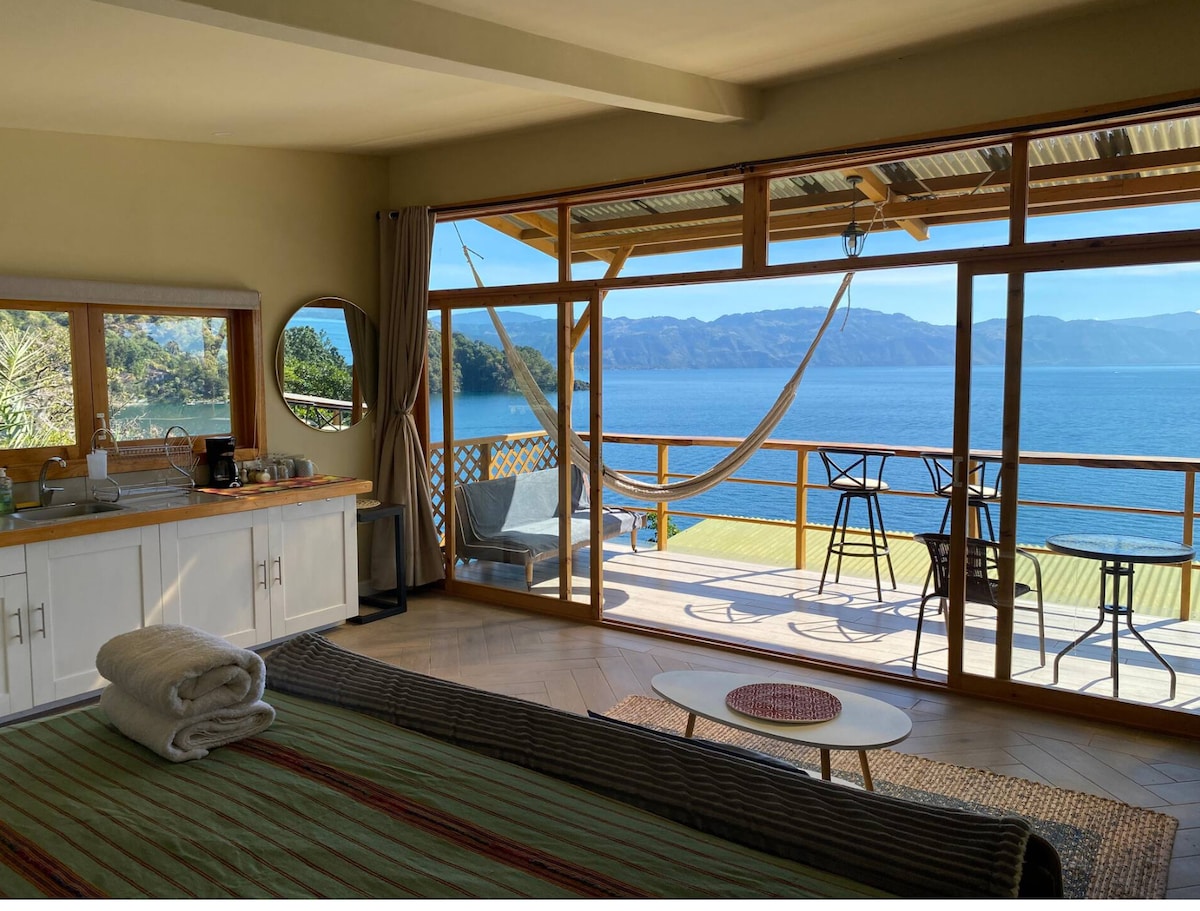 The uniquely designed space has a bright and airy floor plan, with 2 built-in king-sized beds (plus a single), a fireplace, a lounge area which doubles as additional sleeping space (best for kids), a fully-equipped kitchen, a full bath featuring a two-person soaking tub, a dining area, and a 10 meter-long patio with a day bed, hammock and sitting area. Of course, all rooms have spectacular views of the lake and the majestic volcanoes for which Lake Atitlan is known.