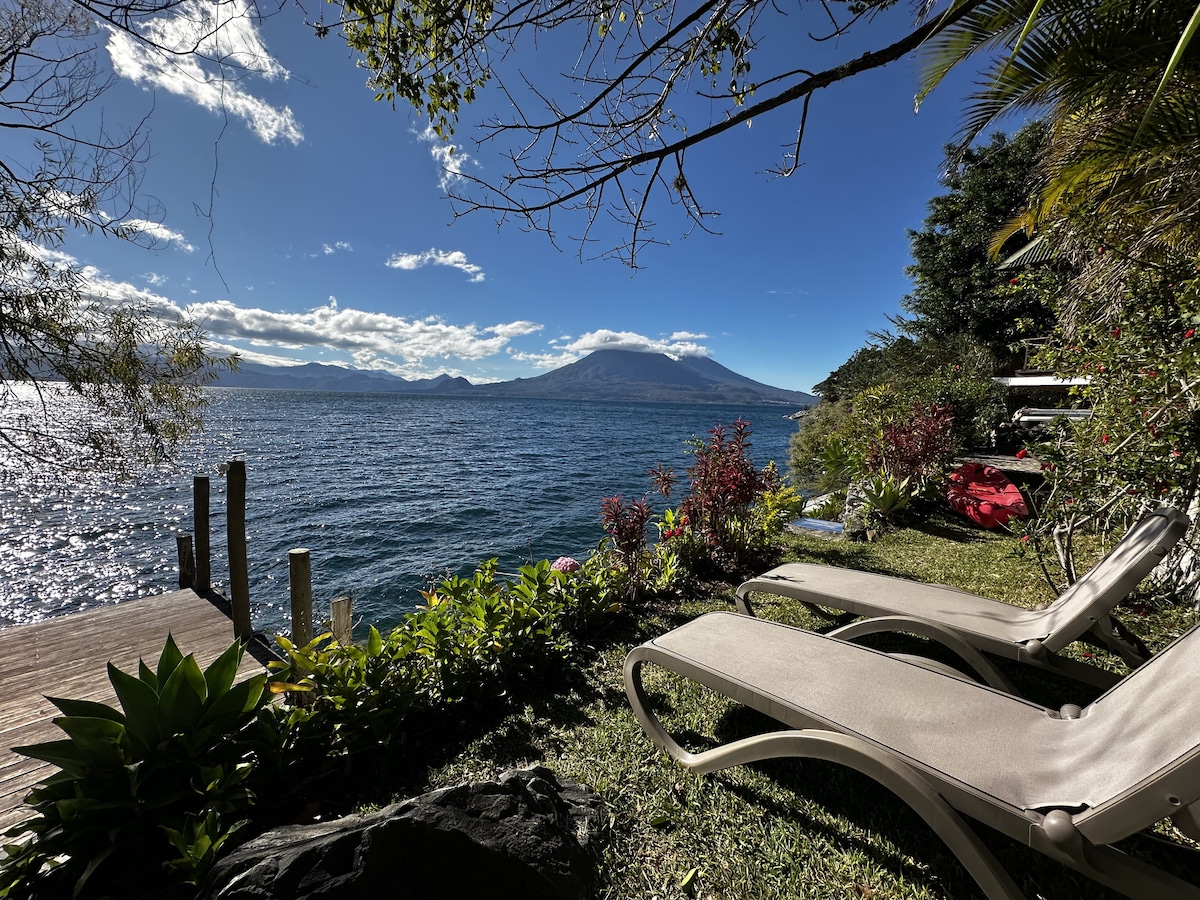 Private lakefront villa with direct water access. Enjoy kayaking, paddle boarding, hot tub, temazcal, gardens, terrace, fire pit, and full kitchen. Two bedrooms, stunning views, and total privacy. Ideal for relaxing with your partner, family, or friends. Private boat rides available amd jetskis to explore the lake. Wake up to volcano views and swim right from your doorstep. Everything you need to disconnect and enjoy the beauty of Lake Atitlán.