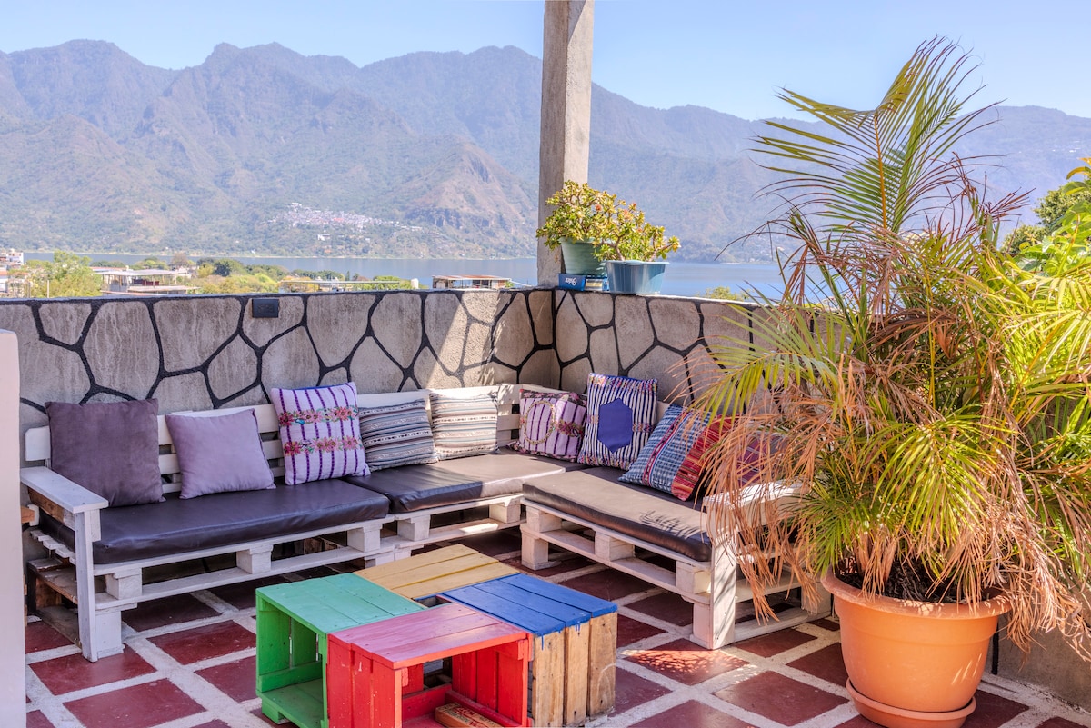 Located on the outskirts of Panajachel but worlds away from the hustle and bustle, this brand new, one-of-a-kind, two-story loft will wow you with its panoramic, 180-degree views of Lake Atitlan and surrounding villages. Soak in the views from almost every corner of this property – including the hot tub situated on a private terrace complete with large retractable umbrella and teak table and chair set. The upper level of the loft has a spacious balcony with oversized hammock & Acapulco chairs, living room, dining room and fully-equipped kitchen. On the lower level of the loft, you’ll find two bedrooms that are separated by a family room. The front bedroom has two twin beds (that can be combined to make a king-size bed) and ceiling to floor windows. The rear bedroom has a queen-size bed. The lower level of the loft also has a roomy bathroom, complete with rain head shower and plenty of hot water. The nearby villages of Panajachel and Santa Catarina Palopo can be reached on foot in about 15 to 20 minutes, or by tuk-tuk (three-wheeled moto taxi) in about five minutes. Other amenities include: • High-speed Wi-Fi • Smart TV with Netflix • Complimentary coffee, potable water in 5 gal jug, olive oil, paper towels are all included • Complimentary multi-lingual concierge service to arrange a variety of amenities including: ground transportation, lake tours in private boat (with or without bilingual guide), private cook, massage therapist, hiking and mountain biking tours that culminate with a gourmet picnic, shopping service to stock your rental with any beverage or grocery items you would like to find upon arrival. A complete list of amenities will be sent to you upon confirmation of your reservation • Complimentary laundry service This loft can be rented together with the adjoining (mirror image) loft accessed through locking double doors on the balcony. Prices include housekeeping service every third day. Fresh towels, bed linens, etc are available apartment request.
