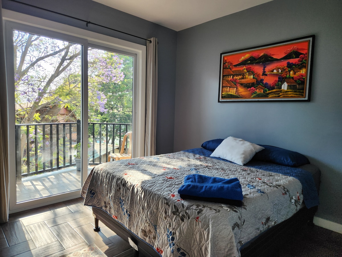 Relax in our cozy, high-end ensuite featuring a handcrafted queen bed by local artisans and modern appliances. Step out to the stunning views of Lake Atitlán, lush gardens, and majestic mountains, creating a peaceful haven for ultimate relaxation. Savour your meals in the sharing elevated outdoor kitchen directly in front of the room, offering a perfect setting to take in the spectacular scenery. Enjoy private access to our pool, sauna, jacuzzi and private dock throughout your stay!