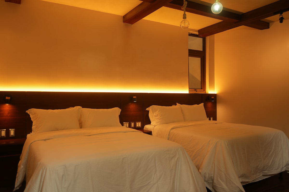 Hospédate en una amplia habitación con dos camas matrimoniales, ideal para 2 a 4 personas. Incluye desayuno gratuito en el rooftop con espectaculares vistas al lago y volcanes. Disfruta de atención 24 hrs, recepción dedicada y espacios modernos diseñados para tu comodidad. La habitación cuenta con cafetera con café y té, agua de cortesía, secadora y baño privado. Perfecta para familias o grupos que buscan confort y una experiencia única en Panajachel.