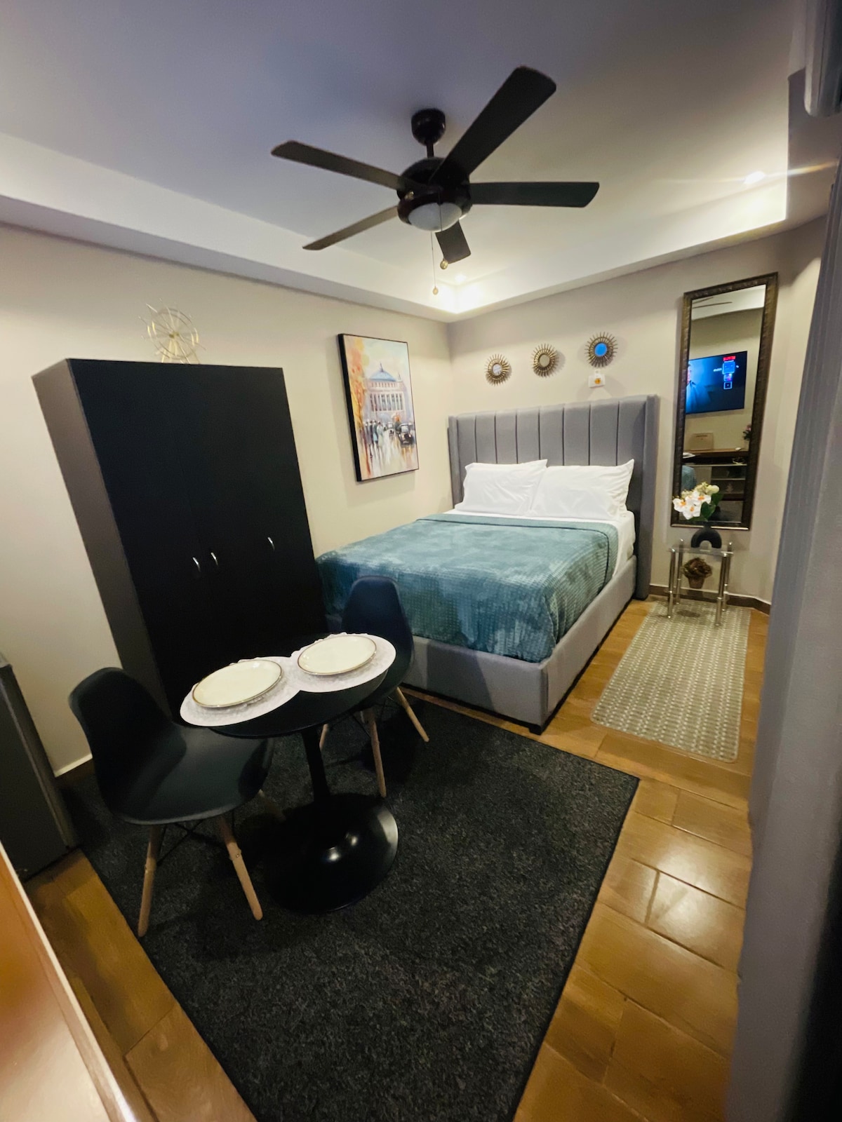 El estudio está muy bien equipado con todo lo necesario ideal para 2 personas que buscan un lugar tranquilo en buena ubicación Cuenta con una pequeña cocina, cama Queen size, área de trabajo, TV, baño privado. El estudio está en la segunda planta. 🏊♀️ La piscina es compartida y su uso es hasta las 10:00pm 🚫 No es permitido las visitas. 👮Solicitamos imagen de identificación de acompañante. ⚡️El edificio NO cuenta con generador eléctrico. Tomar en cuenta todos los reglamento.