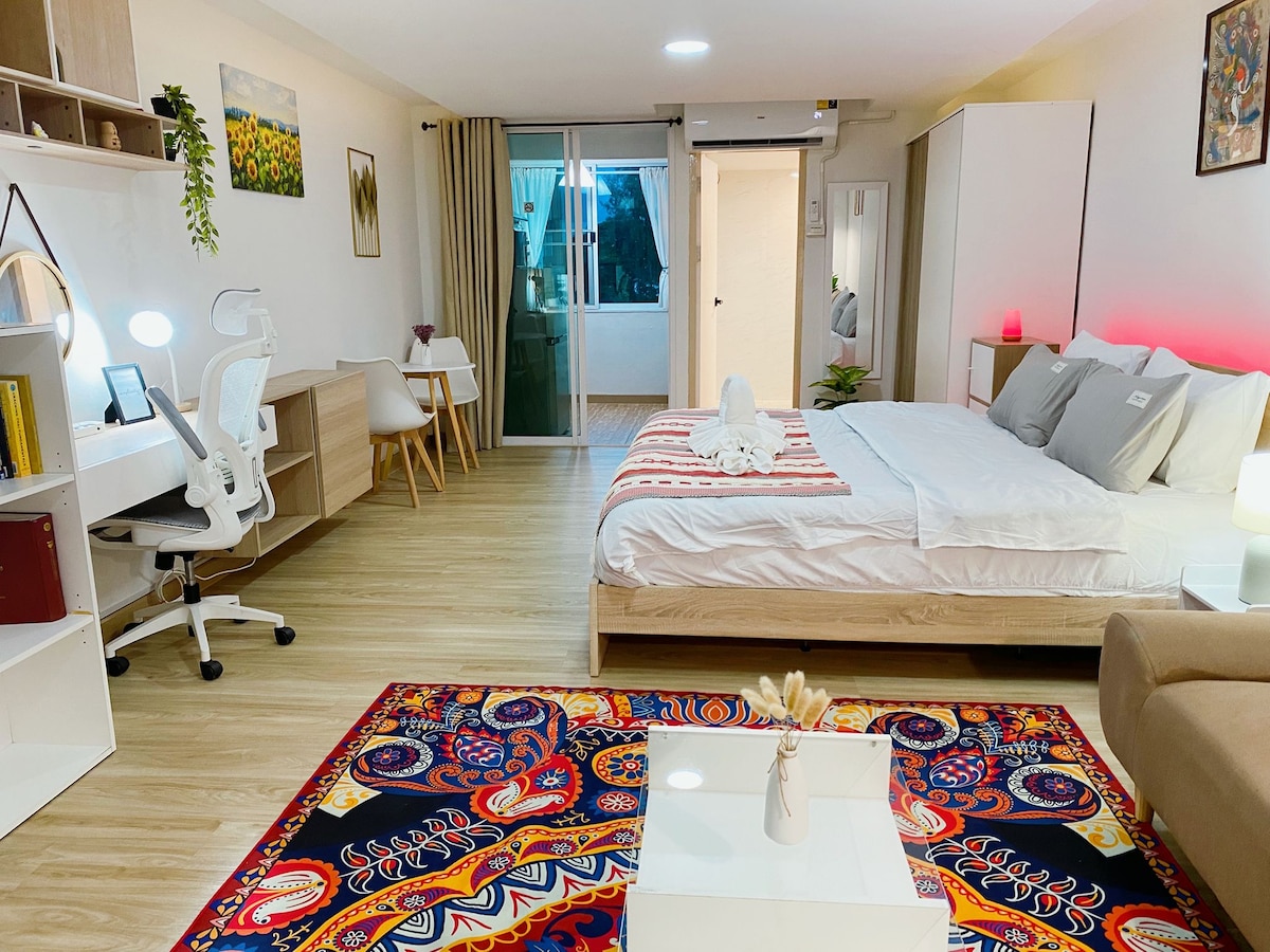全新装修公寓,房间非常大,舒适干净,超大玻璃窗通风采光很好,一楼入口有公寓管理员,入门刷卡,非常安全。 房间内家电家具齐全,电视、洗衣机、冰箱、微波炉、电磁炉、热水壶、餐具🍽️,衣柜衣架,电熨斗,吹风机等齐全。床垫舒适,床上用品全部纯棉布料,保障睡眠品质。 房间内使用光纤网络,网速500M,非常适合数字游民工作和游戏。 位置位于宁曼路11巷,位置极好,楼下有7-11,超市,中餐,泰餐,日料,韩国料理等网红餐厅,世界各式咖啡,拉花冠军等很多网红咖啡店,马杀鸡按摩店、洗衣店等。距离宁曼一号280米,玛雅商城450米,清迈大学1.9公里,就在宁曼路的巷子里,各种精品小店、服装店随你逛,适合打卡拍照,住的非常舒服和便利! 一楼提供免费停车库,汽车🚘摩托车🏍️都可以停,出行便利。