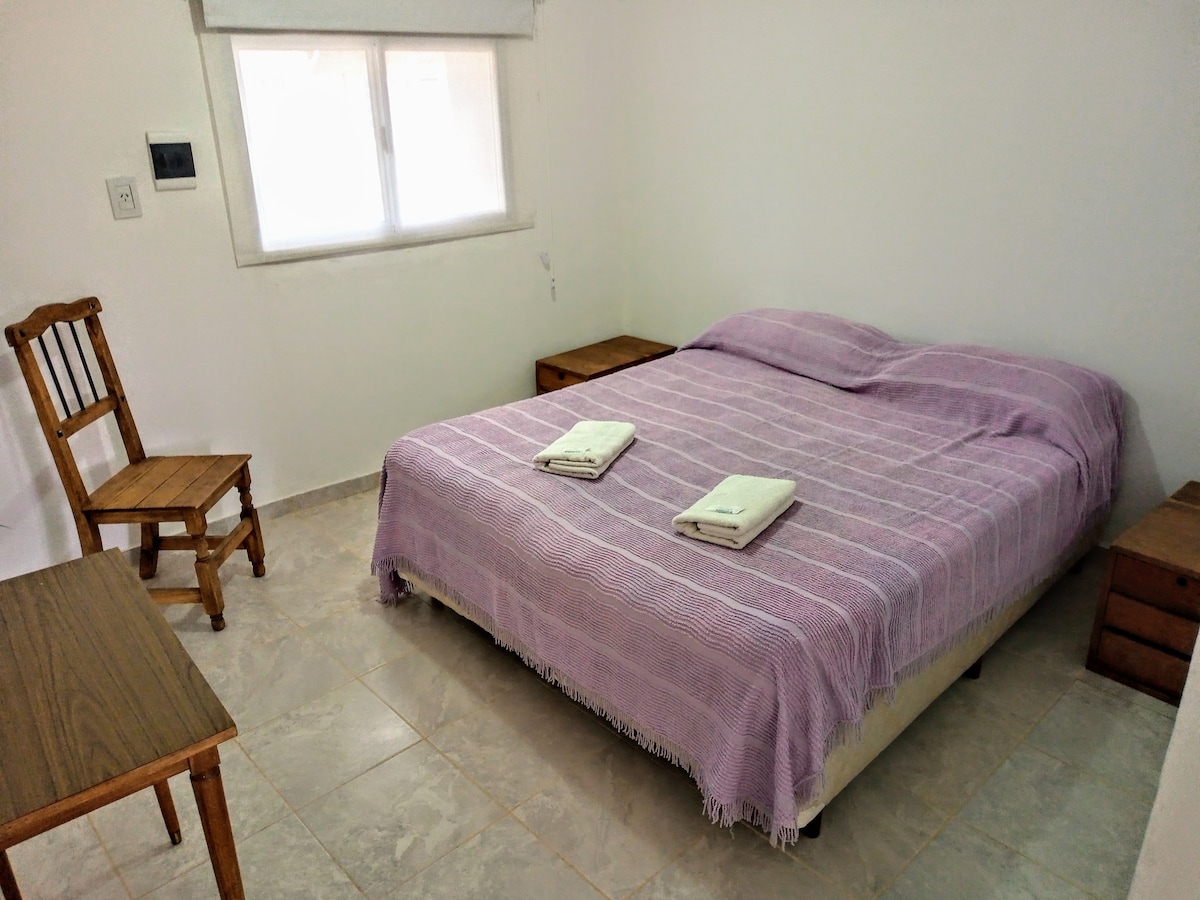 Amplio departamento con pileta para disfrutar de hermosos atardeceres en zona residencial a 800mts de la rotonda del mapa. Departamento en planta para cuatro personas, dos habitaciones, cama matrimonial, dos camas individuales, aires acondicionado, calefacción por radiadores, wifi, tv, microondas, baño completo y cochera. Amplio parque verde con pileta, asador y frutales que harán que descanses y disfrutes de unas maravillosas vacaciones.